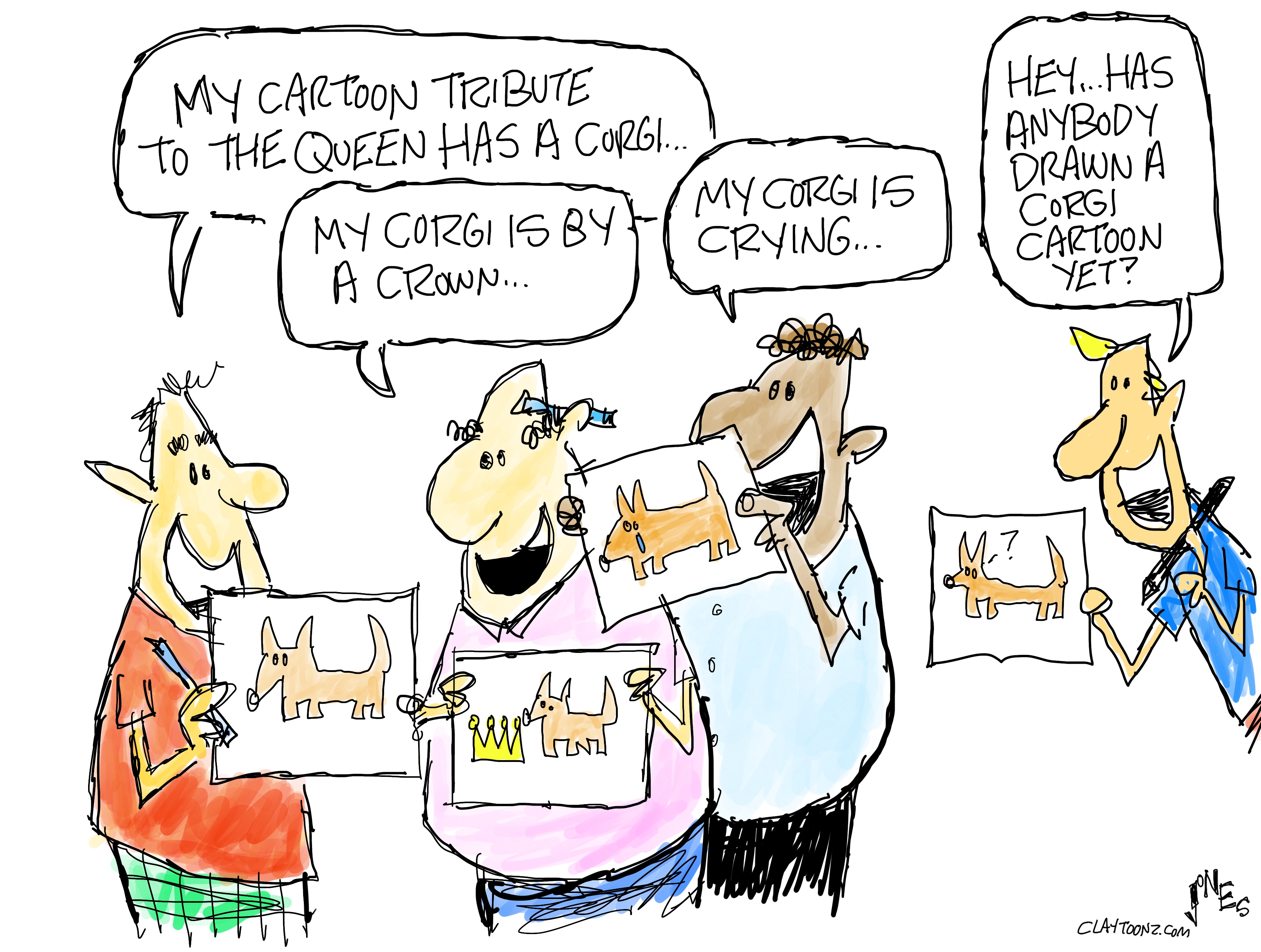 Honestly, this isn’t a case of cartoonists being lazy and unimaginative. It’s really hard to be original, unique, and irreverent with obit cartoons. In fact, after scratching around all day to come up with something unique and brilliant for CNN as a tribute to the Queen (a non-corgi cartoon), two other cartoonists duplicated that cartoon. That meant I had to come up with another cartoon for CNN. There went my Friday.