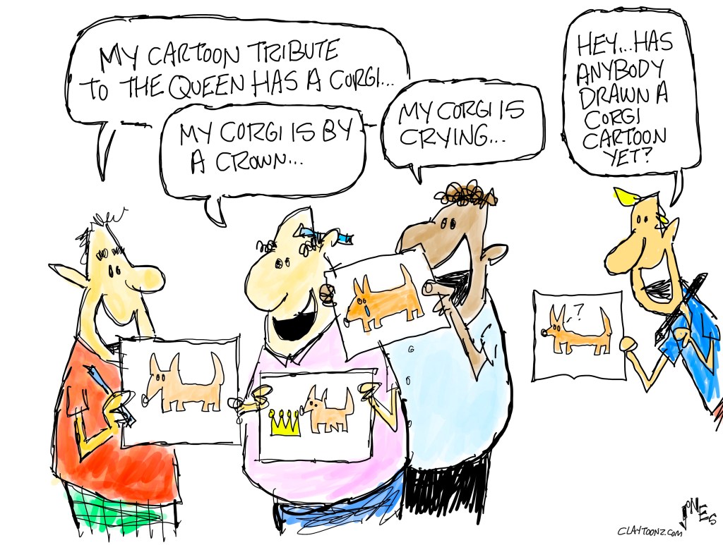 In all honesty, I too came up with a corgi idea on Thursday. I thought it was sweet and brilliant. I remembered how much my readers loved my cartoon of Betty White being greeted in Heaven by doggies. This corgi cartoon of mine was going to go over big time. Why it might even go viral. It was going to be the greatest cartoon anyone in the world had ever seen. Why, it was going to be totally unique and original. Nobody else would think of it, right? Wrong.