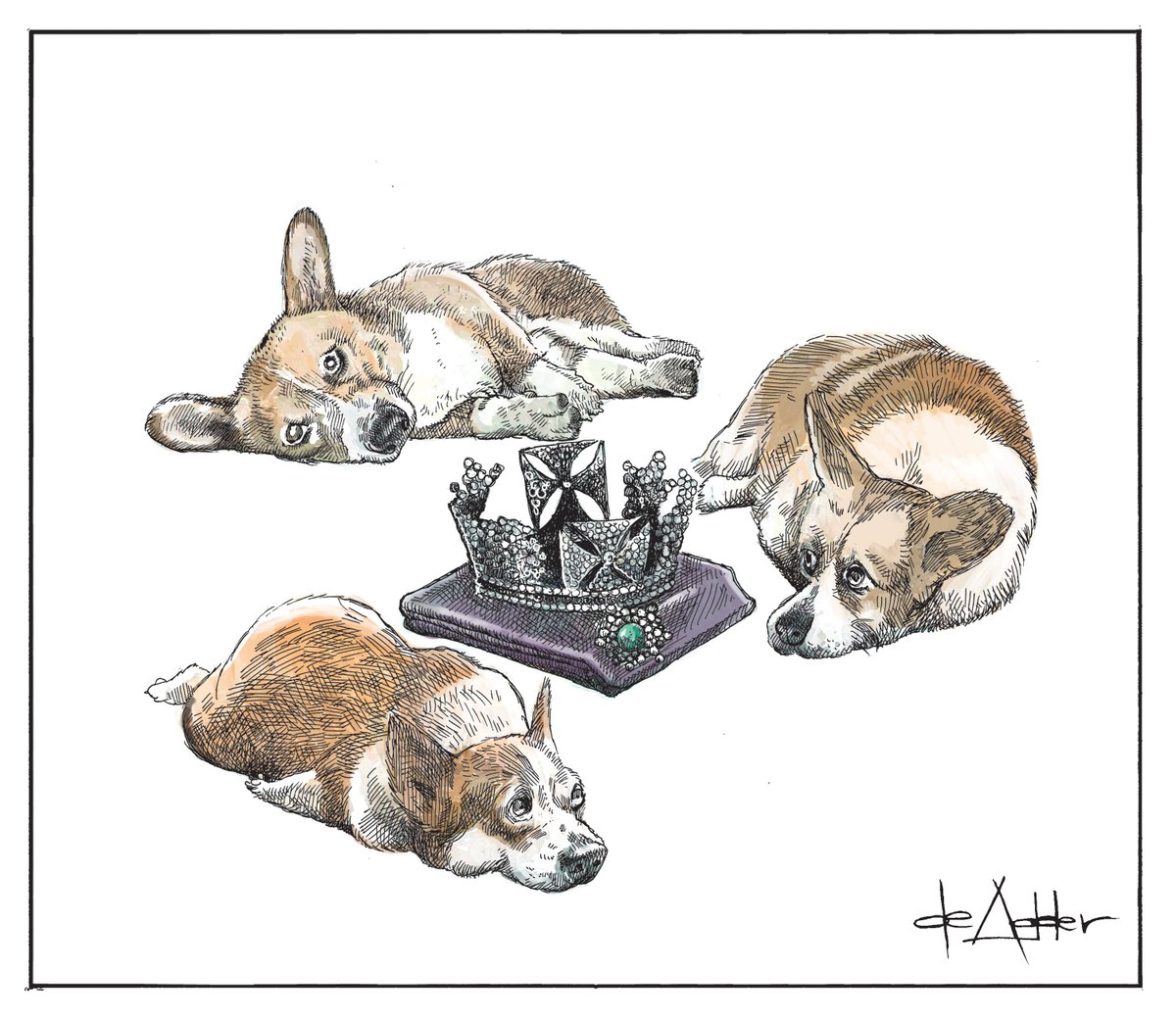 I drew this Thursday afternoon just for social media and to have a little fun with my colleagues. When I drew this, there were at least six cartoons on the Queen featuring corgis. Many more have popped up since.