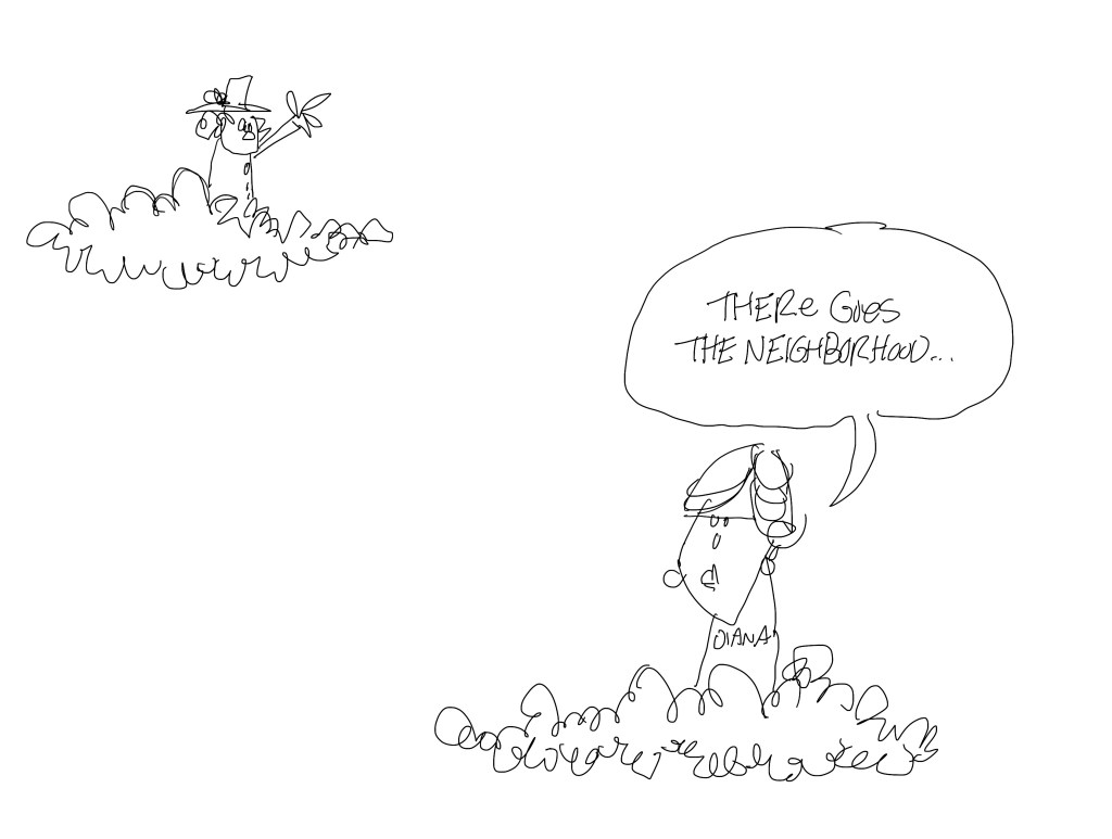 My editor didn’t like this. Maybe he was right. One reader screamed at me for it, thinking it was disrespectful (oh, please) while others just didn’t get it. But, I don’t care. If you had told me 100 people would tweet at me that they don’t get this idea, I would have still drawn it. So, I drew the actual cartoon on Friday afternoon while waiting to hear back from my editor on the next cartoon in this blog. This is my favorite of all of these. And, nobody else did it.