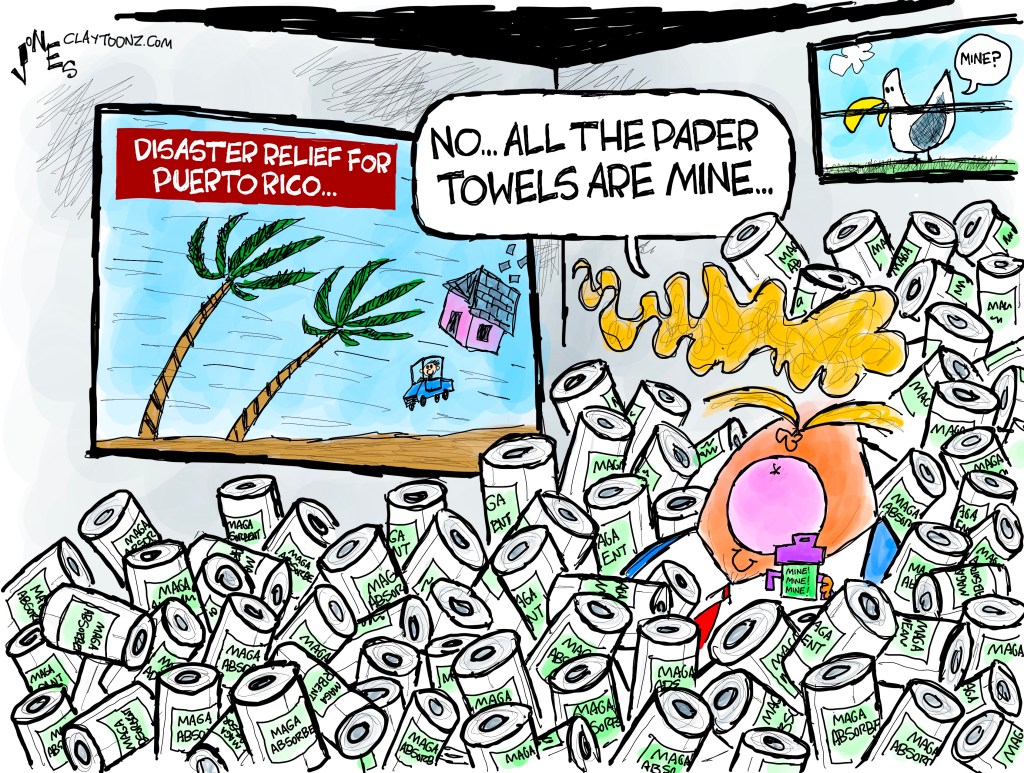 How can I ever look at paper towels the same way again? … “When Hurricane Maria hit Puerto Rico, Donald Trump wasn’t aware that the island was a U.S. territory or that it was even an island. He didn’t know the island had a governor and instead, tried to call Puerto Rico’s president. Unfortunately for Puerto Rico, and the rest of us, its president at the time was Donald Trump (sic).”