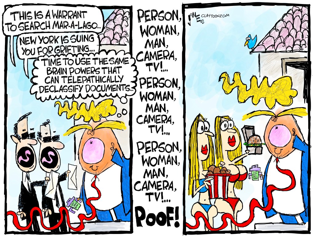 Part of Trump’s defense for having classified government documents at Mar-a-Lago is that he declassified all of them. That doesn’t explain why he took the documents and worked so hard not to return them to the government. It doesn’t explain why he obstructed justice to keep them. It doesn’t explain why documents on the nuclear capabilities of our allies or the personal life of the French president are so personal to him. He has not explained yet why he wants these documents. Maybe he wants to market a new brand of atomic French ticklers.