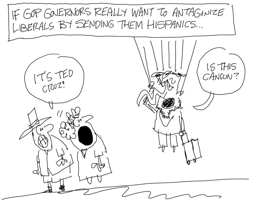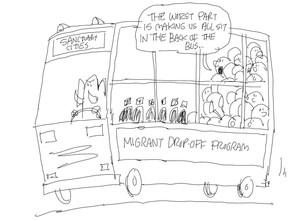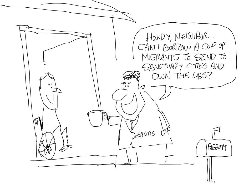 This is a huge batch of roughs and it’s up to you to tell me if any of them are good. There are 27 in all and they were drawn Thursday, September 15, and Friday, September 16. Most of these are the Republican governors’ political stunts of dropping off migrants in “sanctuary cities.”