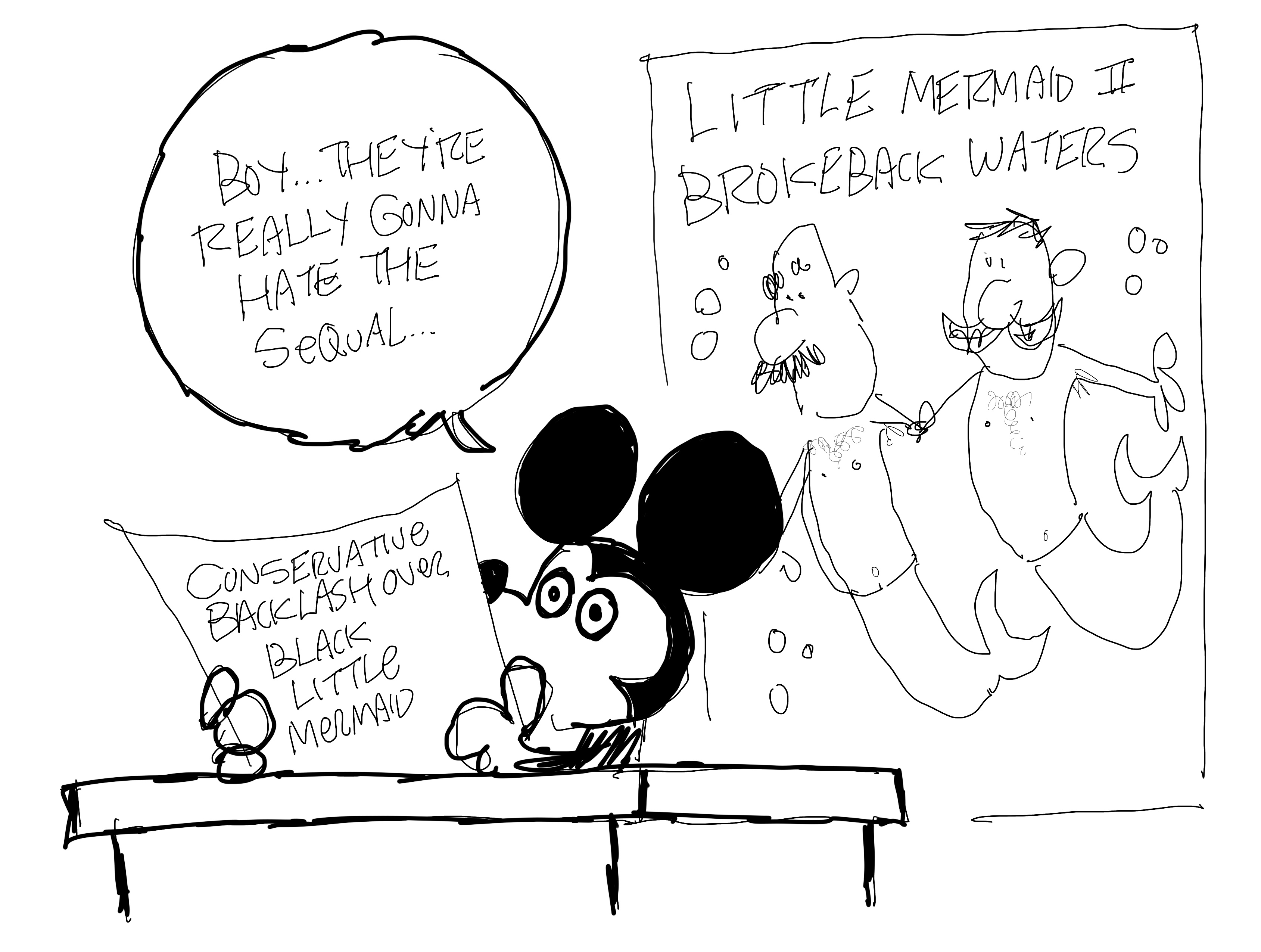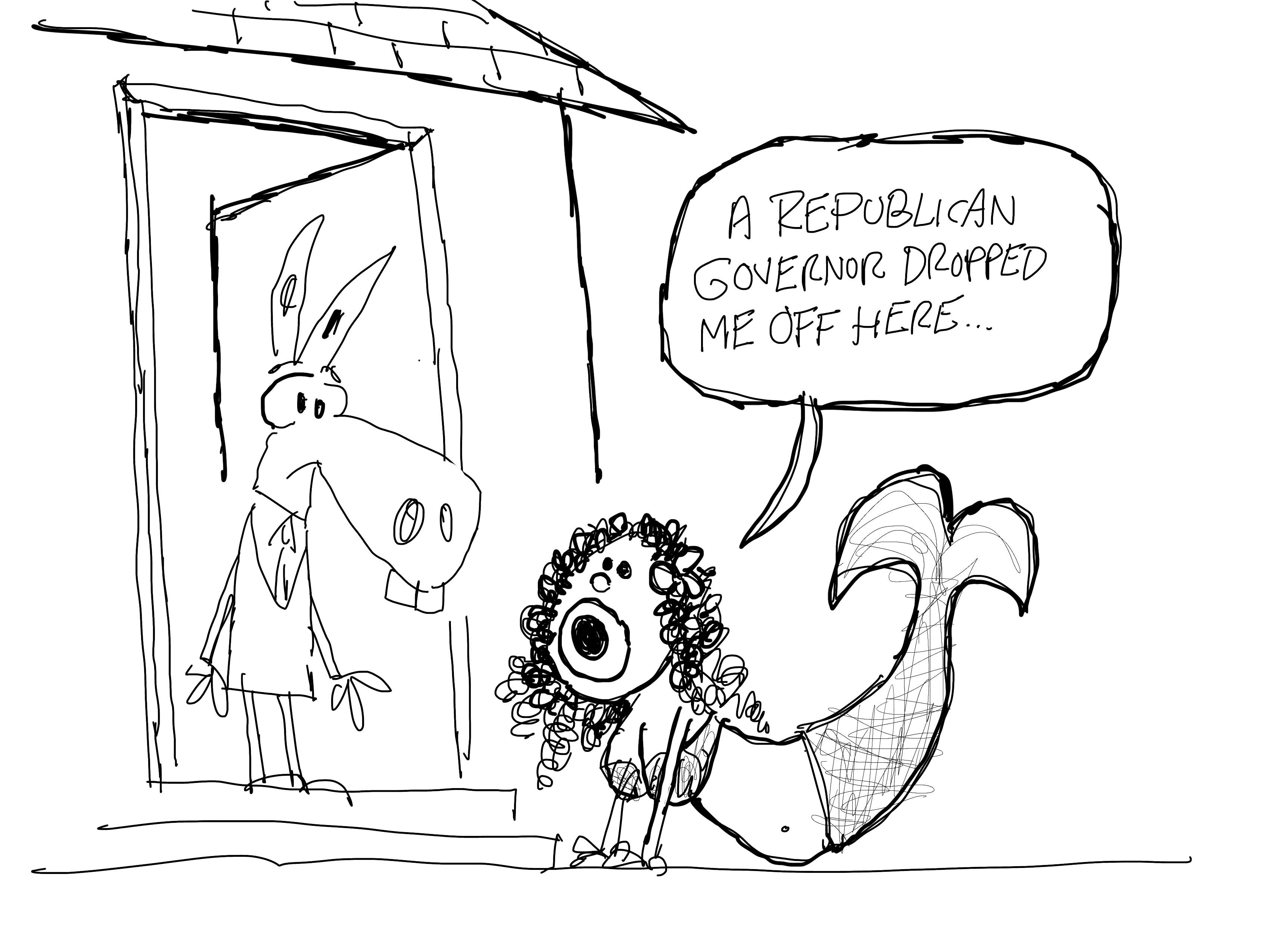 And this one became an official cartoon for my newspaper clients. I called it “Brokeback Waters.” Yeah, I know there’s a typo in the rough version. Roughs are rough.