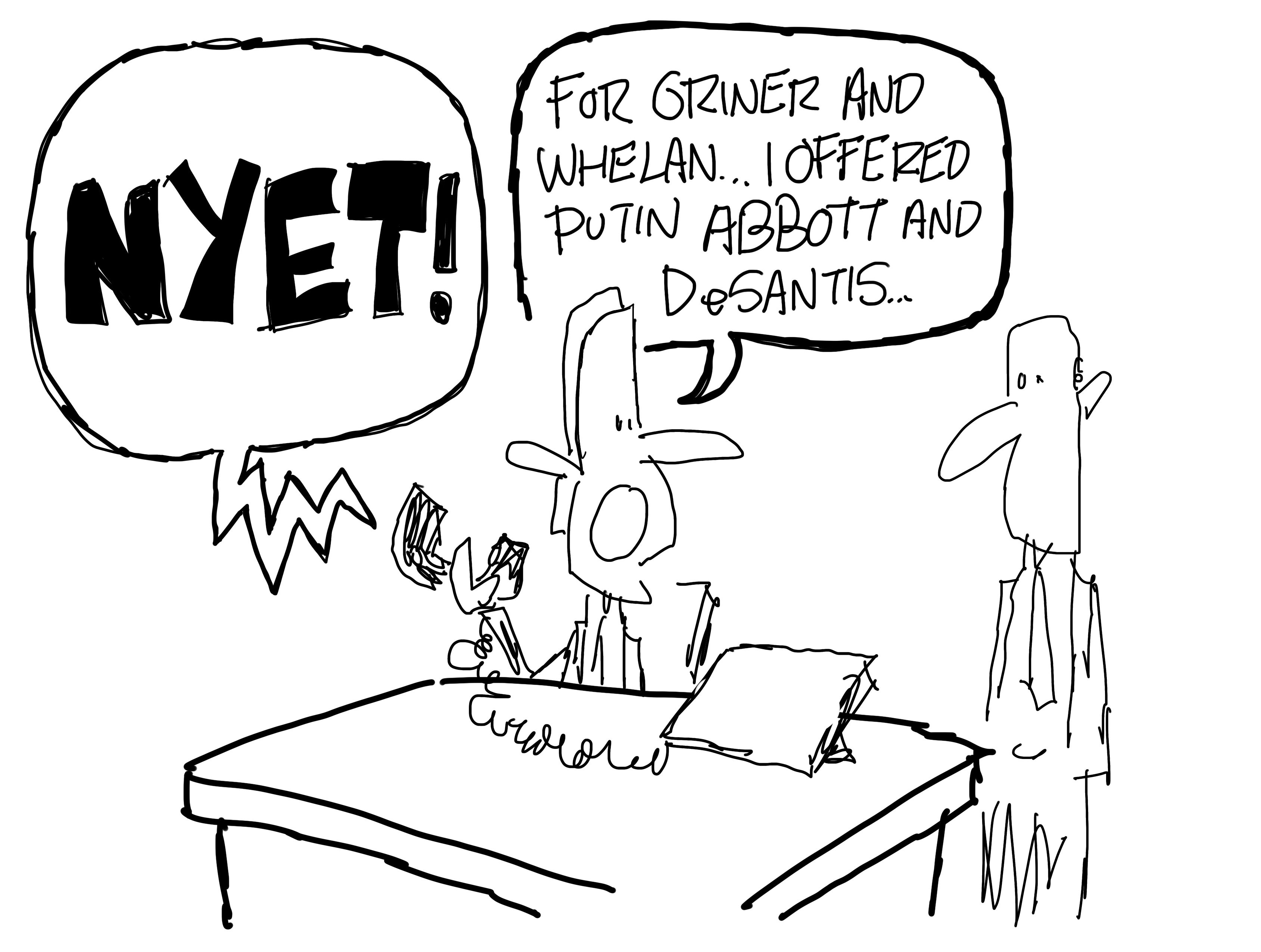 Another cartoonist did something similar to this after I drew this one, except he didn’t have them in cages.