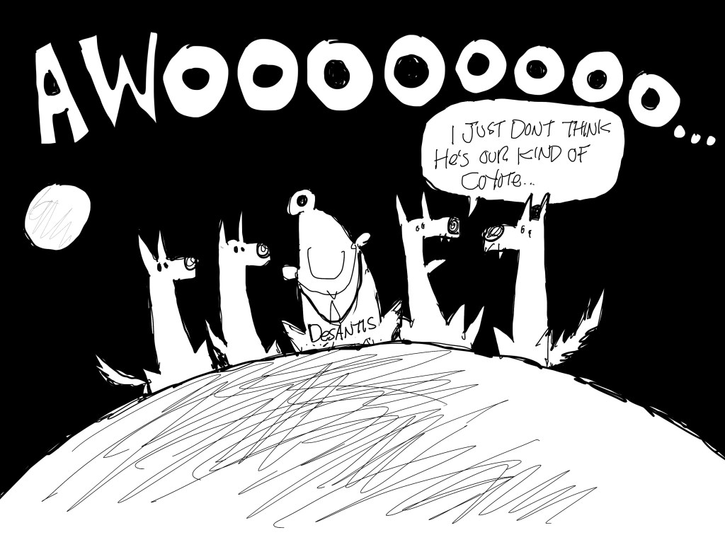 Damn, I really mined this batch for cartoons for my newspaper clients. But, hey. Out of 27 ideas, there should be a few good ones in there, right? I called this one “Coyote Fugly.”