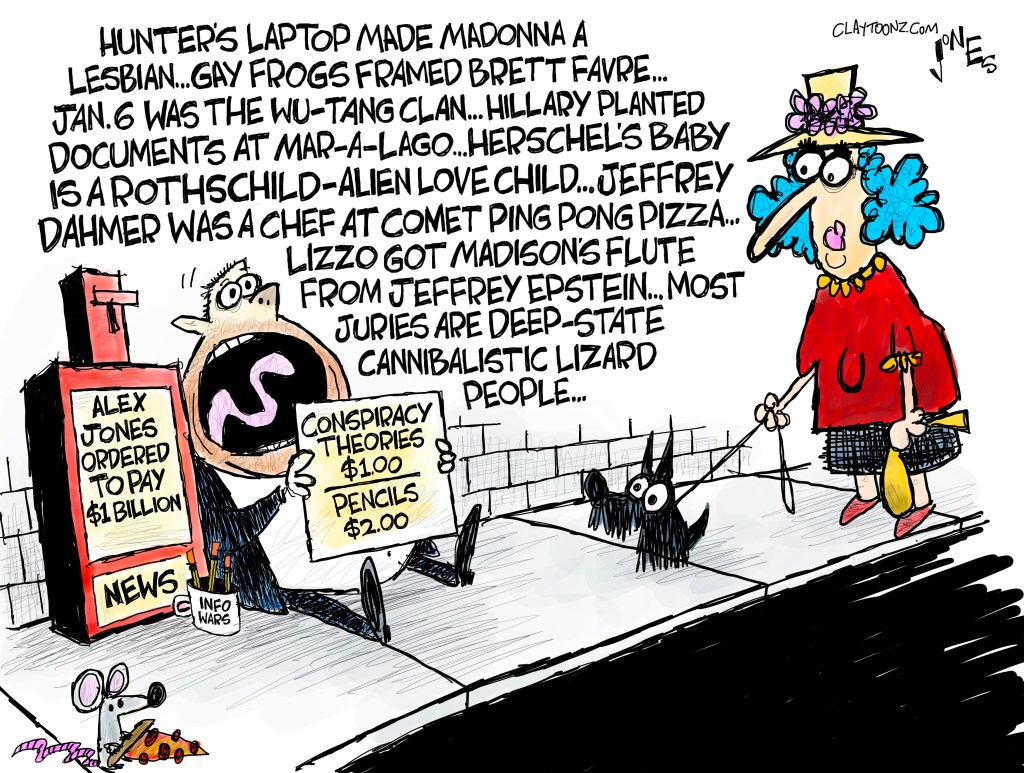 Like in the cartoon, Jones is currently begging for money with bullshit conspiracy theories. It’s just unfortunate he’s not doing it on the streets with the rats, though that is fortunate for the rats.