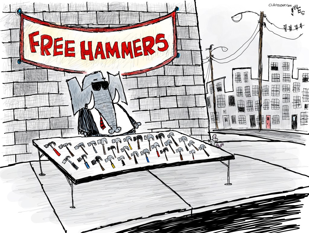 Signed prints: The signed prints are just $40.00 each. Every cartoon on this site is available. You can pay through PayPal. If you don’t like PayPal, you can snail mail it to Clay Jones, P.O. Box 3721, Fredericksburg, VA 22402. I can mail the prints directly to you or if you’re purchasing as a gift, directly to the person you’re gifting.