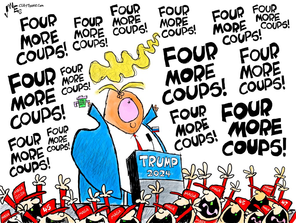 If Donald Trump really believes the last election was stolen and the election didn’t work, then why is he going through the trouble of going through another election? If I take my car through a carwash and it comes out with pigeon crap all over it, I’m not gonna go through that carwash again. The only reason for Trump to run for president again when he believes, as he stated last night, that our democracy is a “rigged and corrupt system,” is to use the 2024 election as a vehicle for another coup attempt.