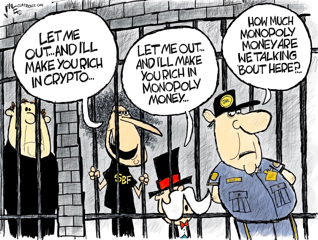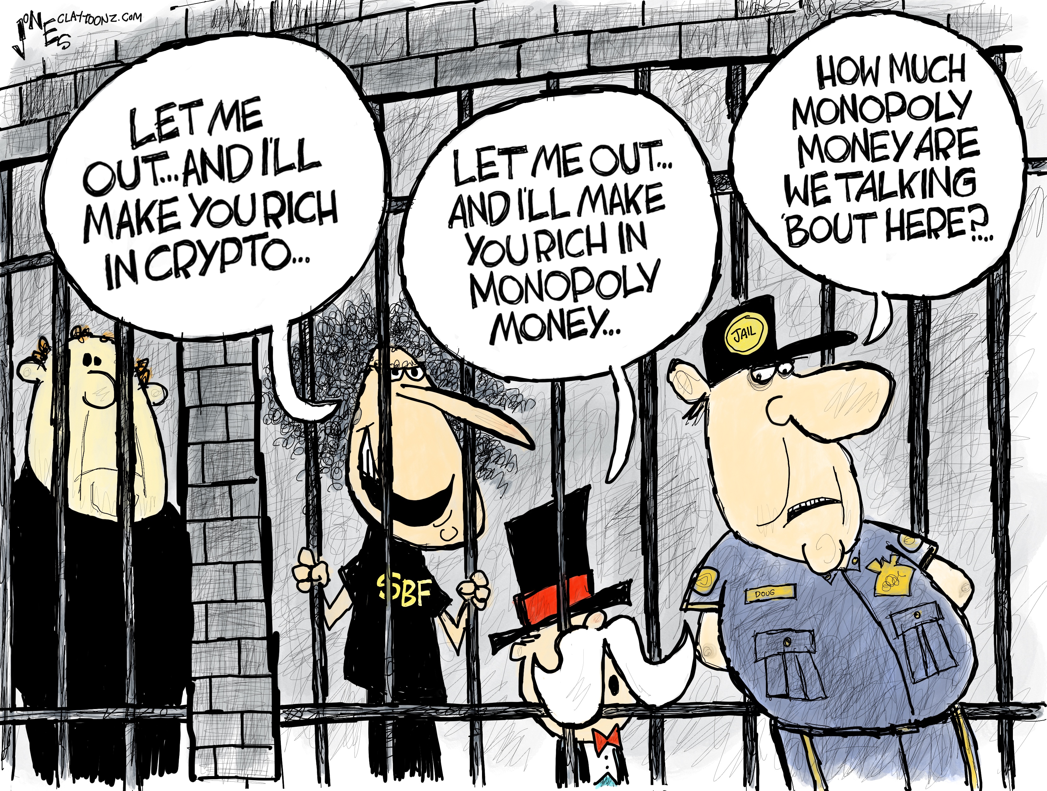 1. This article is both hilarious and insightful! As someone who also struggles to fully understand cryptocurrency, I appreciated the author’s honest take on the subject. And the story of SBF’s rise and fall in the world of crypto is truly wild. But what really got me laughing was the author’s Facebook suspension and the mention of “Taliban Waldo.” Keep doing you, Clay Jones! Your cartoons and commentary always brighten my day. And I might just have to snag a signed print or copy of your book while I’m at it.