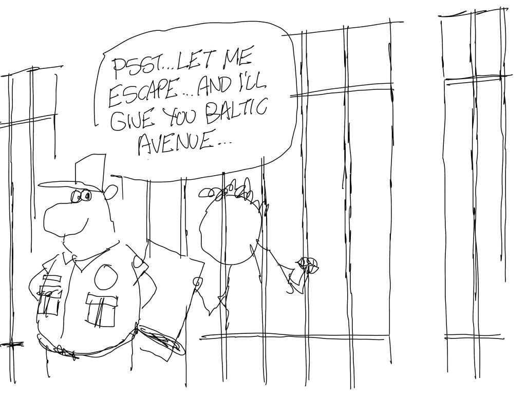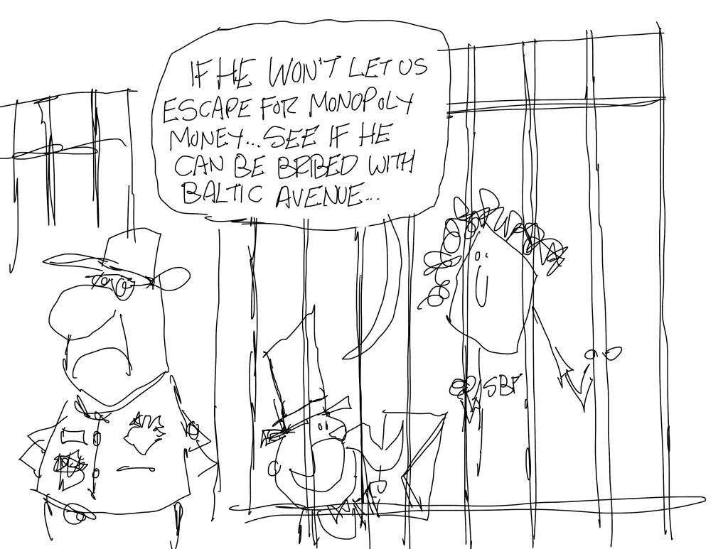 The proofer who didn’t get the Monopoly Man cartoon got this one while the one who did get the Monopoly Man cartoon didn’t like this one. That happens every now and then and I usually move forward with the idea I prefer anyway, but this time I thought I could do better. I also showed both to a few other friends and that just really messed me up as everyone had a different favorite.