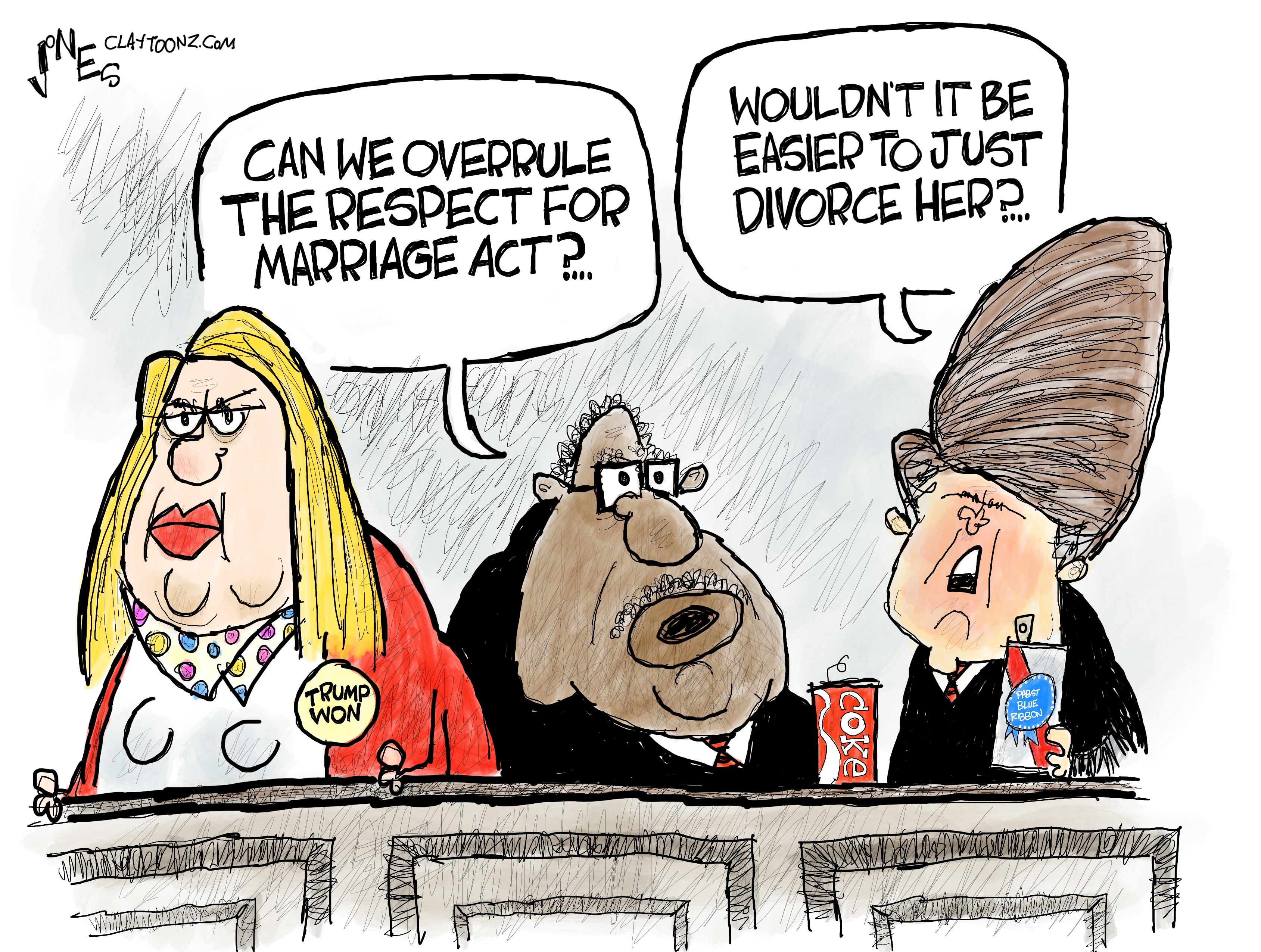 Clarence Thomas is in a mixed marriage, so he’s at least open-minded to that unless he thinks he’s a white guy (that’s not totally out of the question). He’s also signaling that he and Ginni have never done it in the butt which is something none of us should ever think about. If that’s in your brain now, my bad.