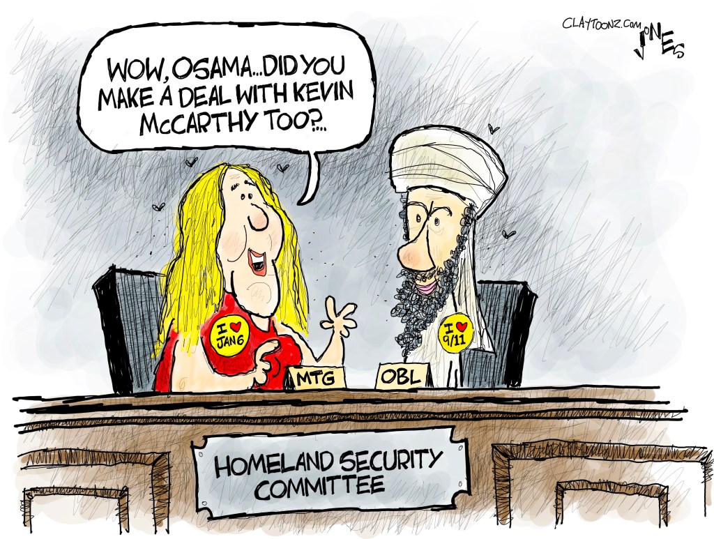 I keep hoping to wake up from the nightmare that is defined by the current U.S. House of Representatives, but so far no luck. The House “leader” has placed the most UNqualified candidates in positions on committees that he could find, and they are indulging their fantasies with “investigations” that they know are bogus, that will have no effect other than to turn the House into a three-ring circus! And we pay these arseholes for this! Grrrrrrrrrrrrrrr. Clay Jones of Claytoonz fame has written an excellent piece about a couple of these unqualified clowns sitting on committees. For the record, I fully agree with all he says. Thank you, Clay!