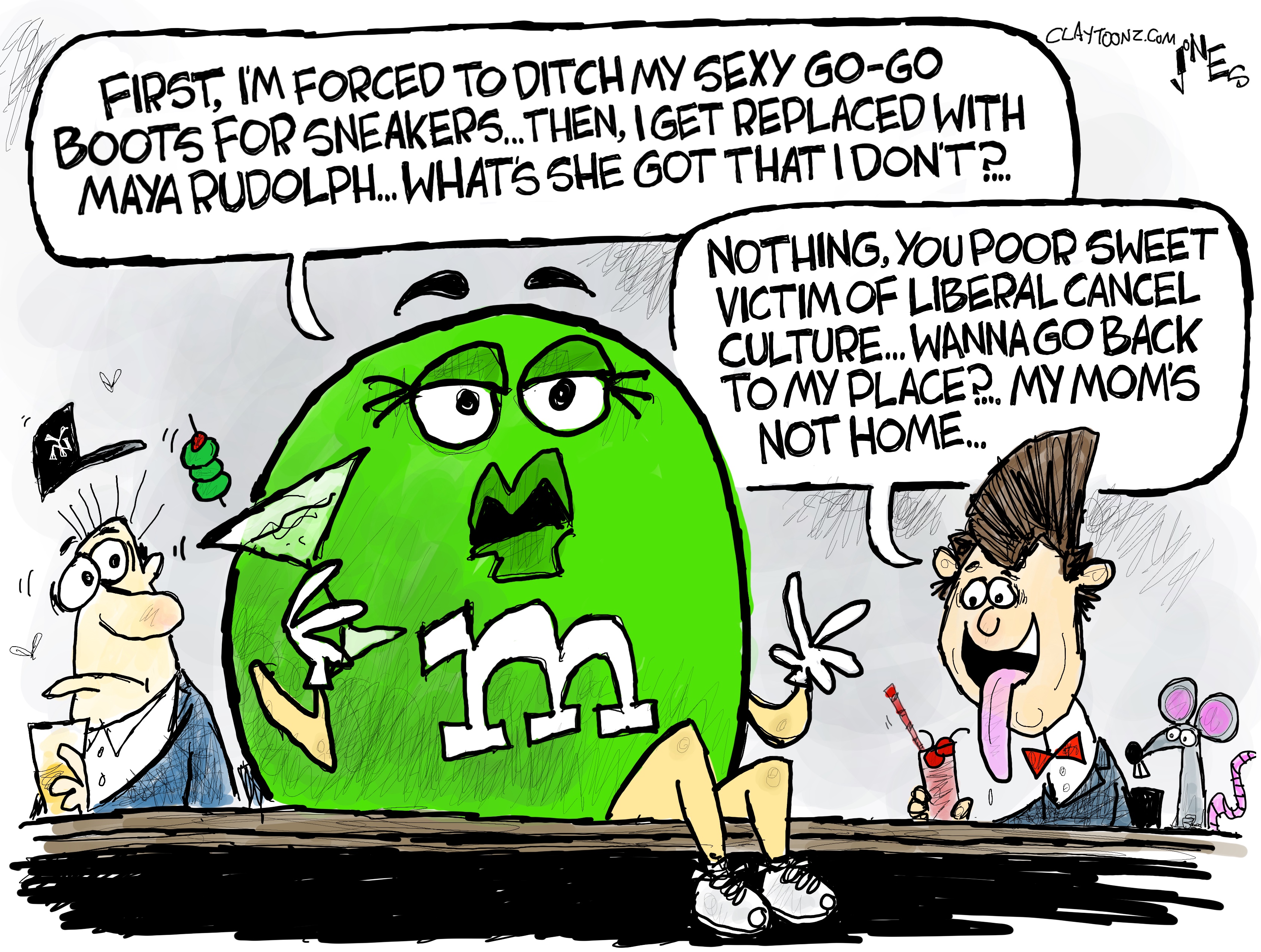 About a year ago, Green M&M lost her knee-high go-go boots for sneakers. Tucker was upset and added it to his long list of cancel culture outrages like Dr. Seuss removing one of its more racist books from future publications, Mr. Potatohead dropping the “Mr,” the sexual-harassing French skunk being removed from Space Jam 2, and Velma having the hots for Daphne. Wait. That last one hasn’t happened yet, has it? We should tell Tucker that Fred has a thing for Shaggy. That will blow his mind. Ruh-roh!
