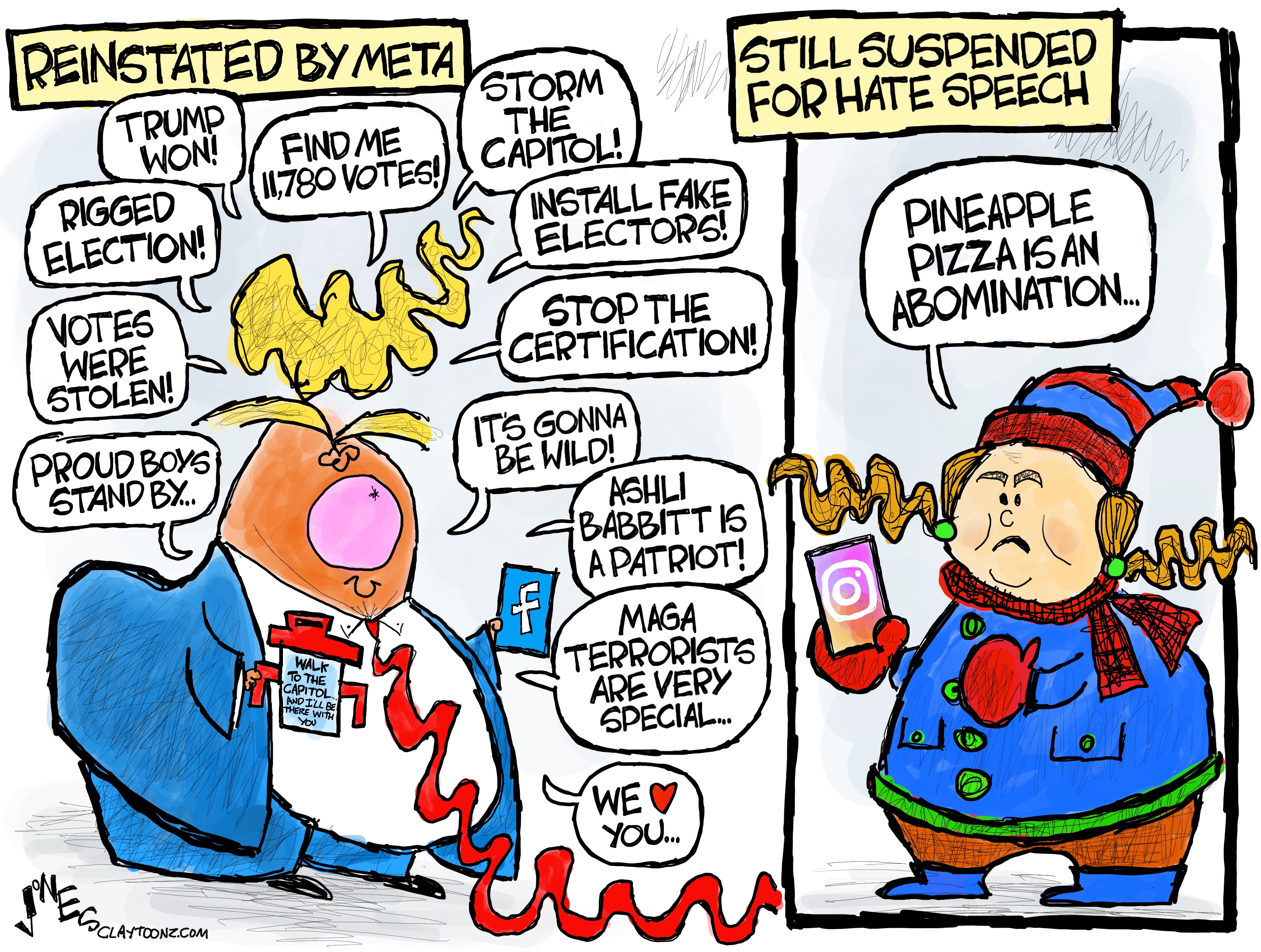 Creative note: I’m allowed to draw two cartoons on the same issue. But my newspaper clients can’t use my cartoon for CNN Opinion on this issue, but I know a lot of them would have used it. So I created another for them to use. This is it. And I bet a person exists who was suspended by Meta for hating on pineapple pizza.