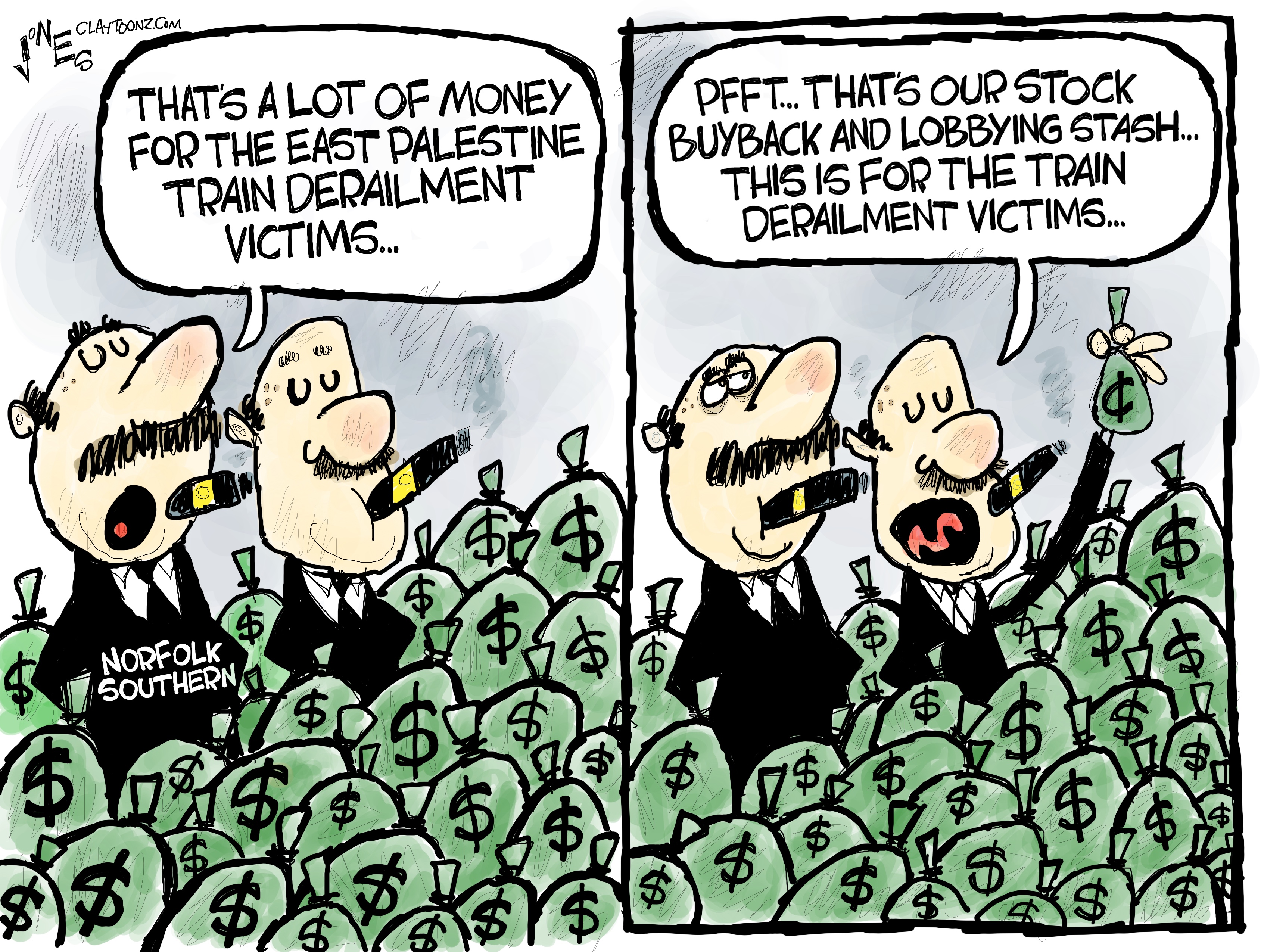 I’ve seen a lot of cartoons by my right-wing colleagues on the train derailment in East Palestine, Ohio. I’ve seen them from Michael Ramirez, Chip Bok, Mike Lester, Mike Beckom, Henry Payne, Dana Summers, Gary Varvel, Branco, Tom Stiglich, Steve Kelley, Al Goodwyn, and Ben Garrison and they all have one thing in common. Not one of those cartoonists has mentioned Norfolk Southern, the corporation responsible for the train derailment and environmental disaster.