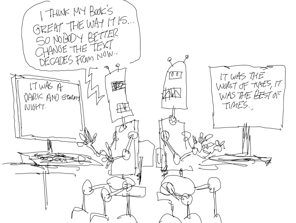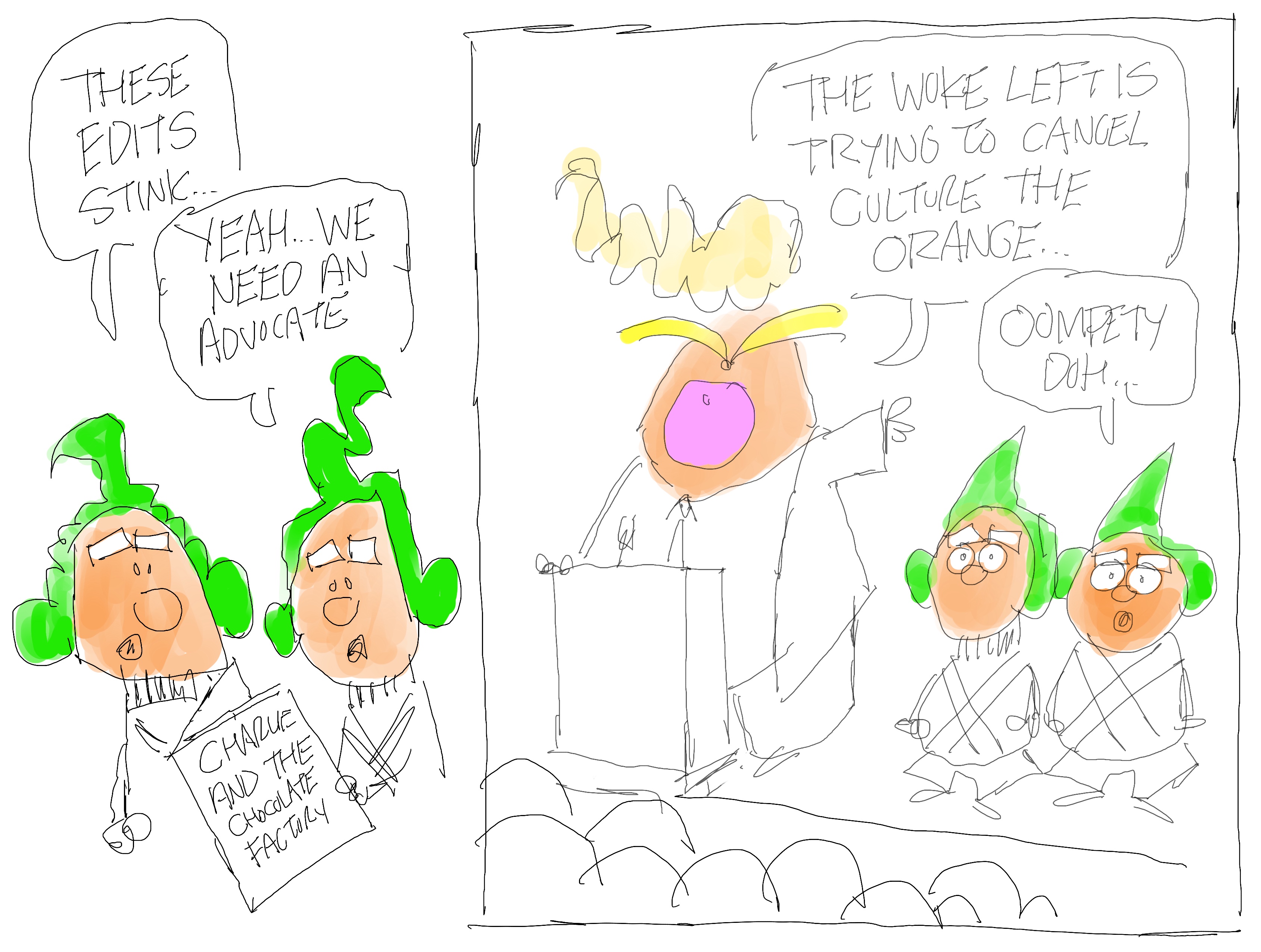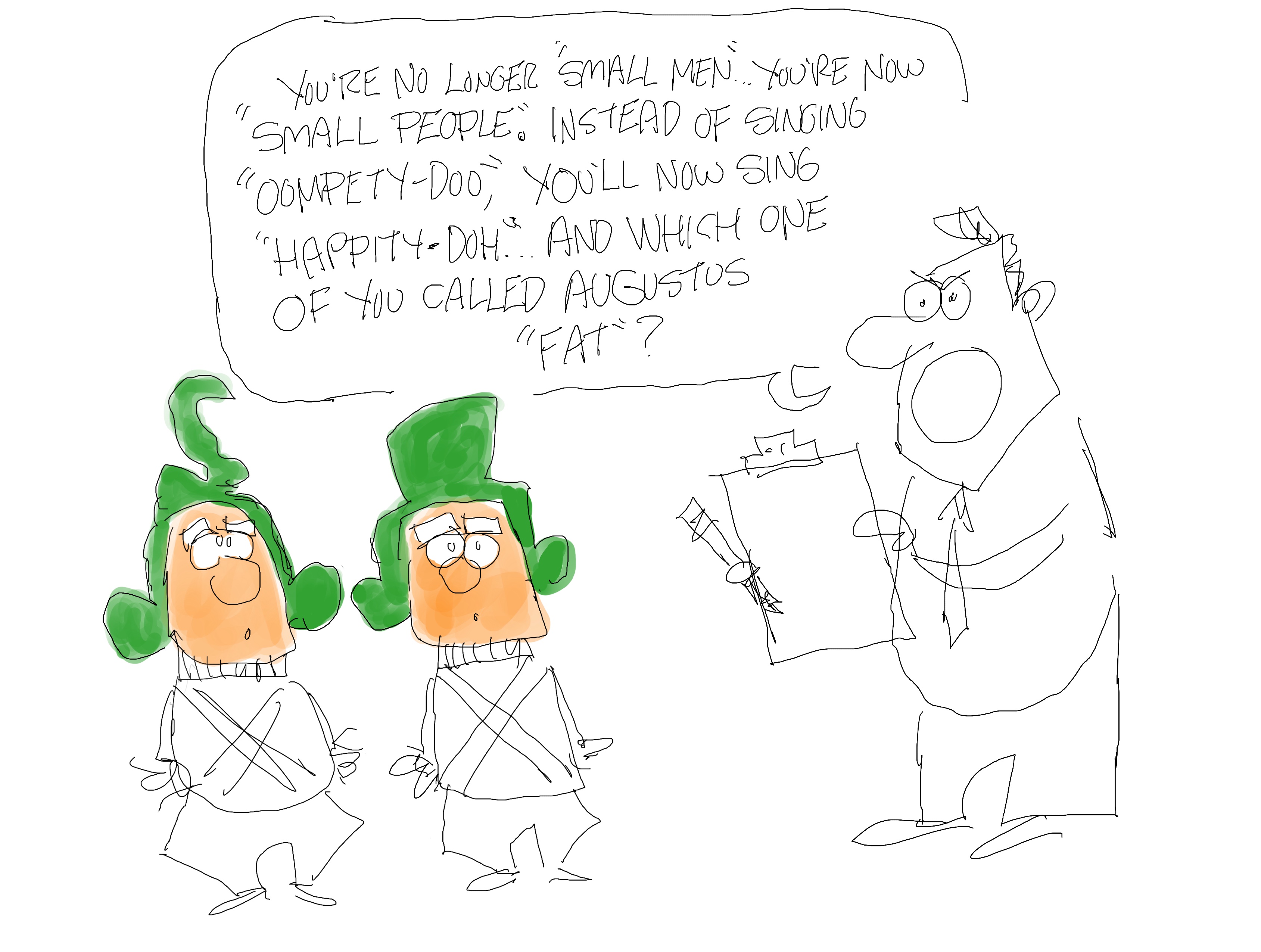 Honestly, I like this one better than the two Oompa Loompa cartoons below. I was going to label the guys “AI” or something like that. I liked this because it took on the edits to Roald Dahl’s books while also saying something about artificial intelligence writing books and creating art.