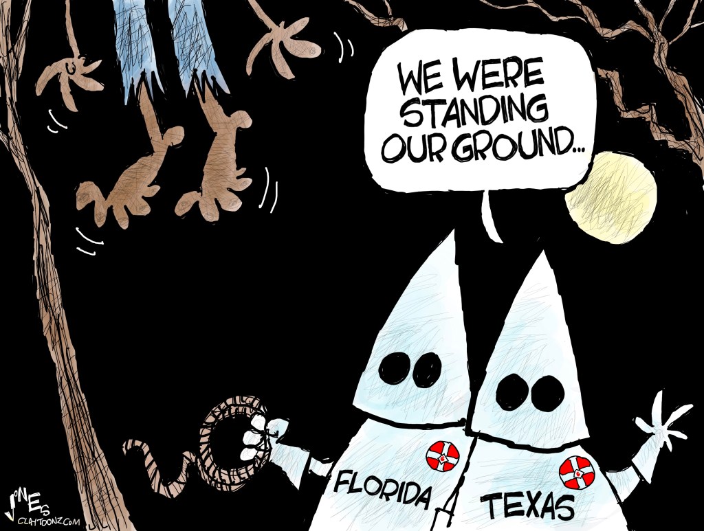 Zimmerman now makes an income by selling his “paintings” of Confederate flags. He initially sold other “paintings” that turned out to be copies of other people’s artwork and photos (hey, tracing cartoonists. Don’t be a George Zimmerman). Kyle is working on a video game called “Turkey Shoot” where a cartoon Kyle shoots turkeys that represent the media. That’s nice.