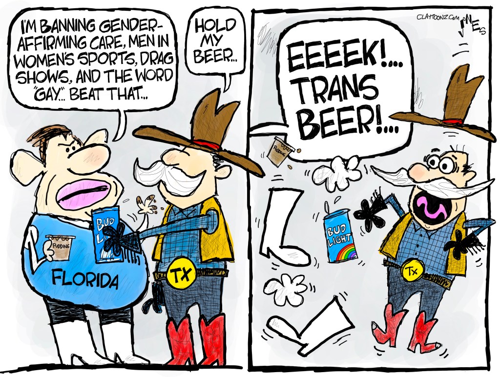 DeSantis is a bigger bigot than Kid Rock and I say this because Rob Ritchie (Kid Rock) may be faking it for his audience (this is a guy who panders to the point of drinking a Bud Light while wearing a Coors hat) where as Puddin’ Fingers is the real deal. DeSantis has banned the word “gay” in public schools, has banned gender-affirming care, has gone on rants and tirades about men in women’s sports, and is scared of drag queens. His lead is being followed in every red state in the country. Even in blue states, Republicans are trying to push through homophobic and transphobic legislation. Even if it fails, it solidifies their bigotry to their base almost as well as shooting trans beer cans.
