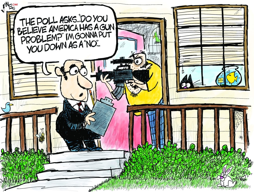 A couple weeks ago, Politico ran a cartoon by the “anonymous” cartoonist (shame on you, Politico). And in the cartoon, he points out that the percentage of gun ownership in this nation has remained steady since the early 70s. He is correct but what the Canadian cartoonist pretending to be a U.S. cartoonist misses is the number of households that own more than one gun, the types of guns, and the sheer volume of guns in this country (the country I live in, not the one the “anonymous” cartoonist lives in).