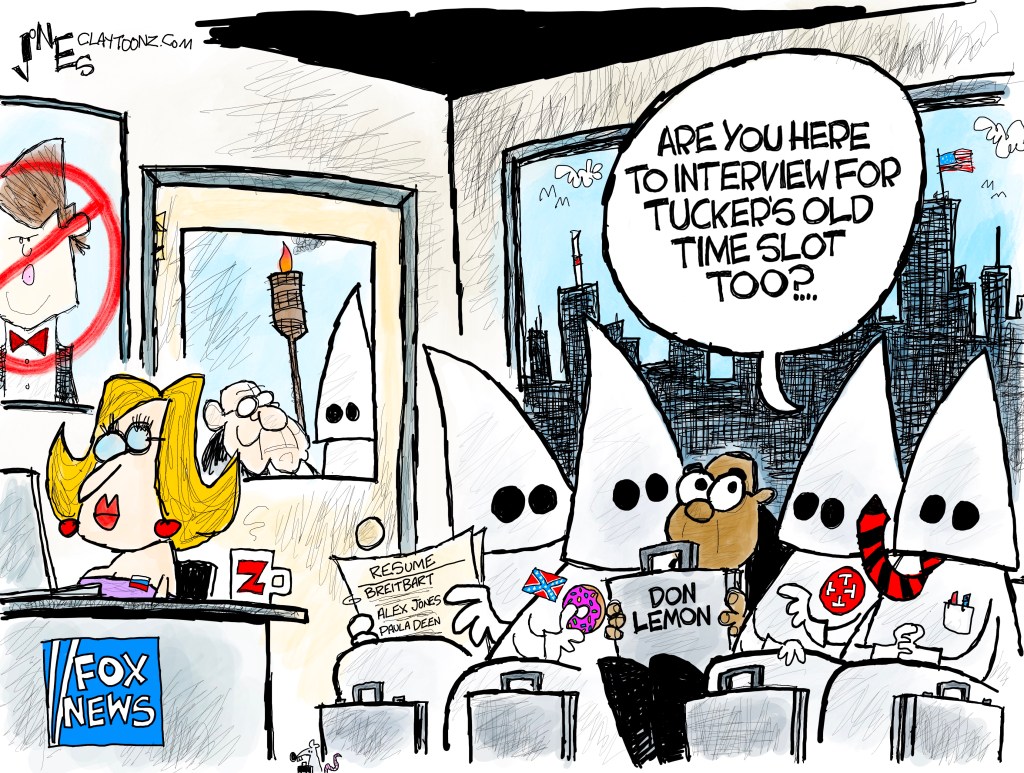 I had to stop drawing the cartoon I was drawing yesterday to do something about Tucker Carlson. In the middle of drawing that cartoon, the editor of the Tucson Sentinel, which publishes my cartoons, messaged me on Facebook to tell me that CNN had fired Don Lemon. This editor knew I was working on a Tucker cartoon. I looked at my TV, which was tuned to CNN, but they weren’t reporting on Don Lemon. However, I did get an alert on my iPhone from CNN about the firing. I’m subscribed to so many news alerts, it’s ridiculous.