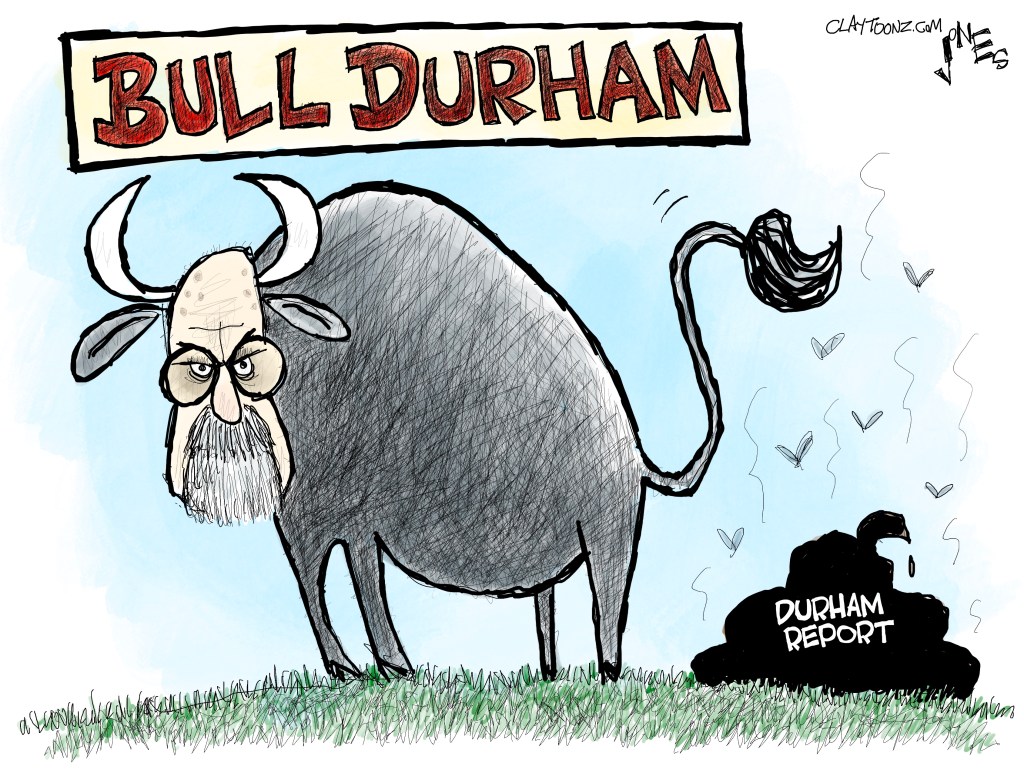 And as usual, the goon cartoonists are all tingly inside about it too while not doing a good job of understanding it. For example, Henry Payne and Lisa Benson both use Trump’s empty talking points which I suppose is easier than thinking for yourself. Chip Bok is perfectly fine without seeing any proof and with just taking Durham’s word for it, as are Scott Stantis, Dana Summers, and Gary Varvel. As sexist Steve Kelley usually does, he lied about it. There are two things Bob Gorrell calls the Durham report “explosive” while not telling us what’s so explosive about it. I got your explosive right here, Bob.
