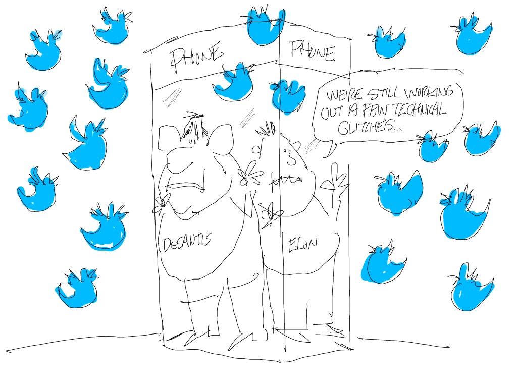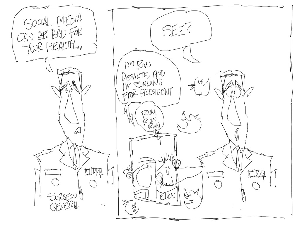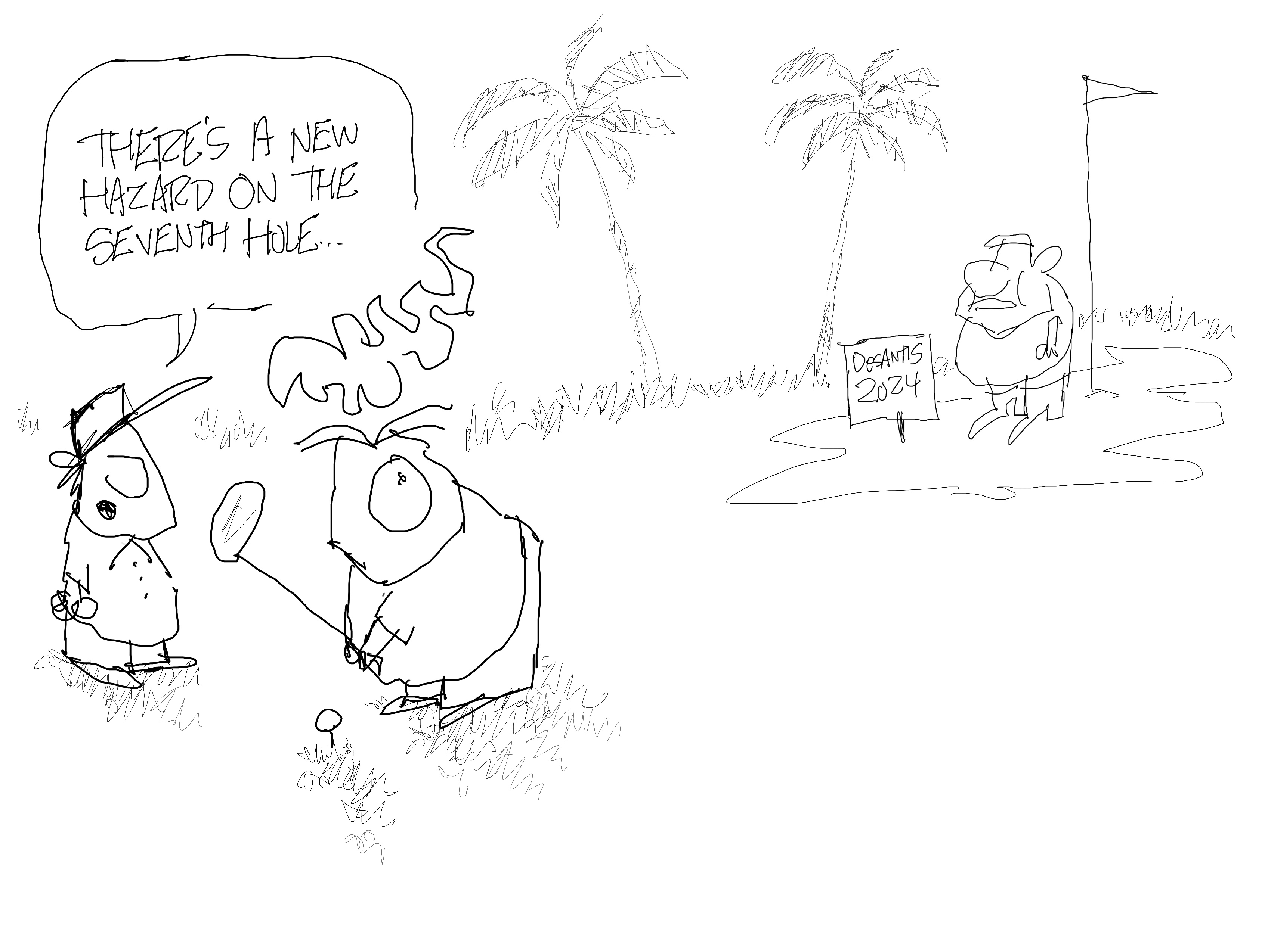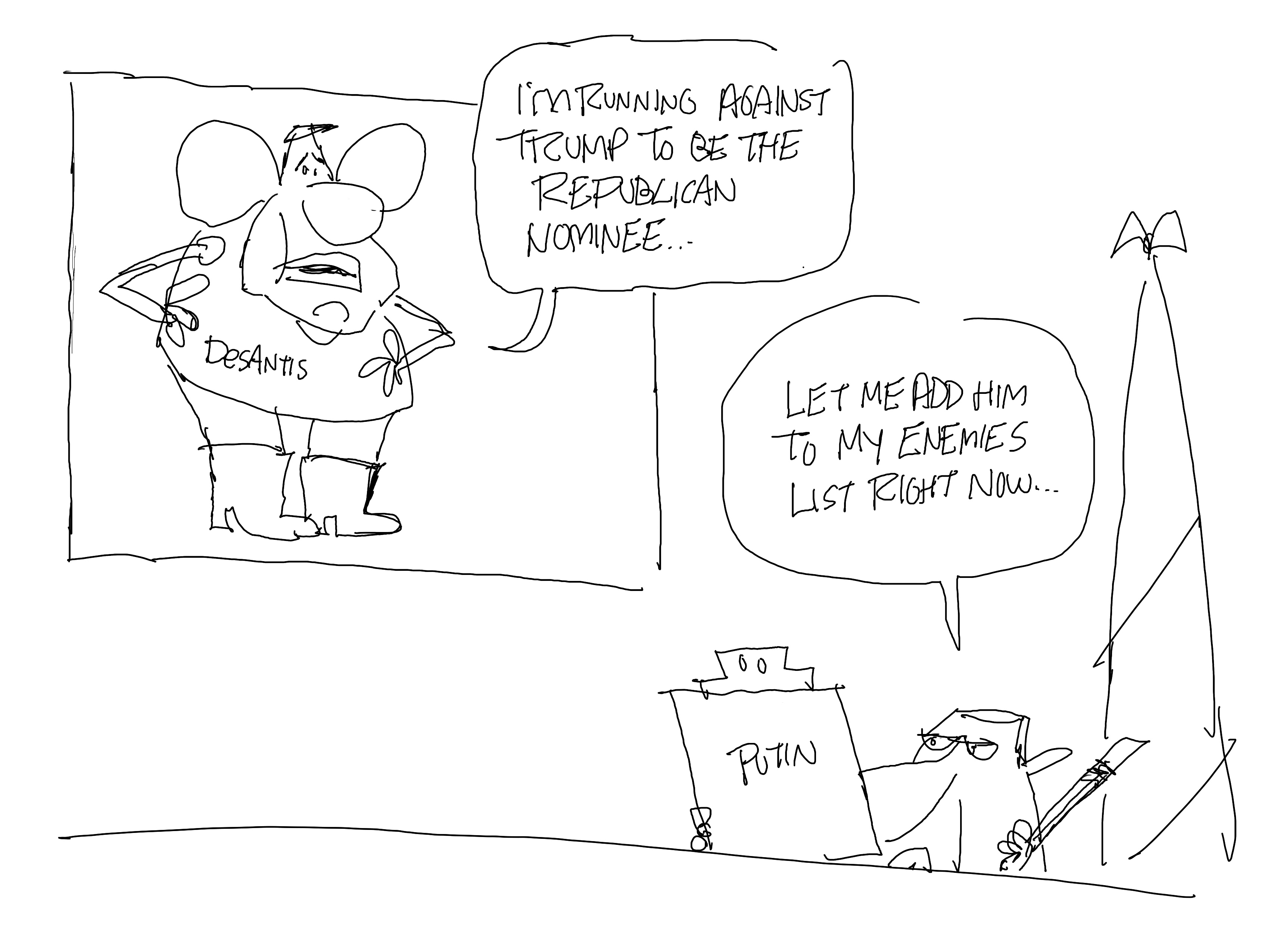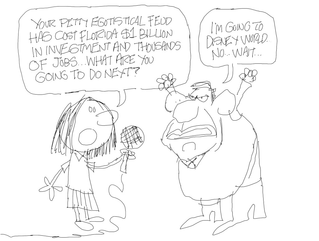 Most of these roughs were drawn on May 25 and 26. The first four on DeSantis and Disneyland were drawn a few days before. I was struggling one morning trying to find the right idea for the news that Disneyland was pulling a $1 billion investment out of Florida.