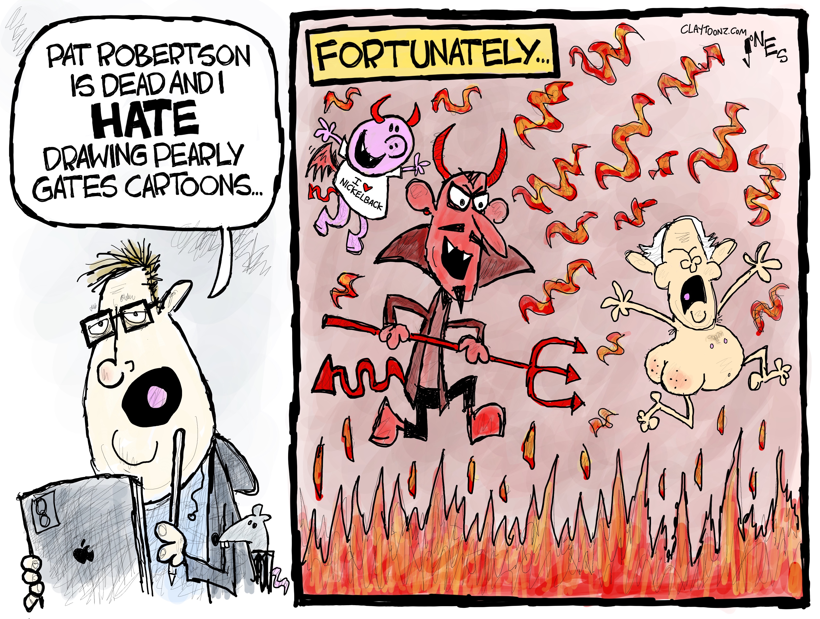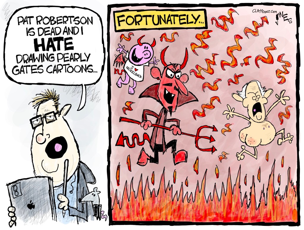 9 thoughts on “Obligatory Pat Robertson Obituary Cartoon