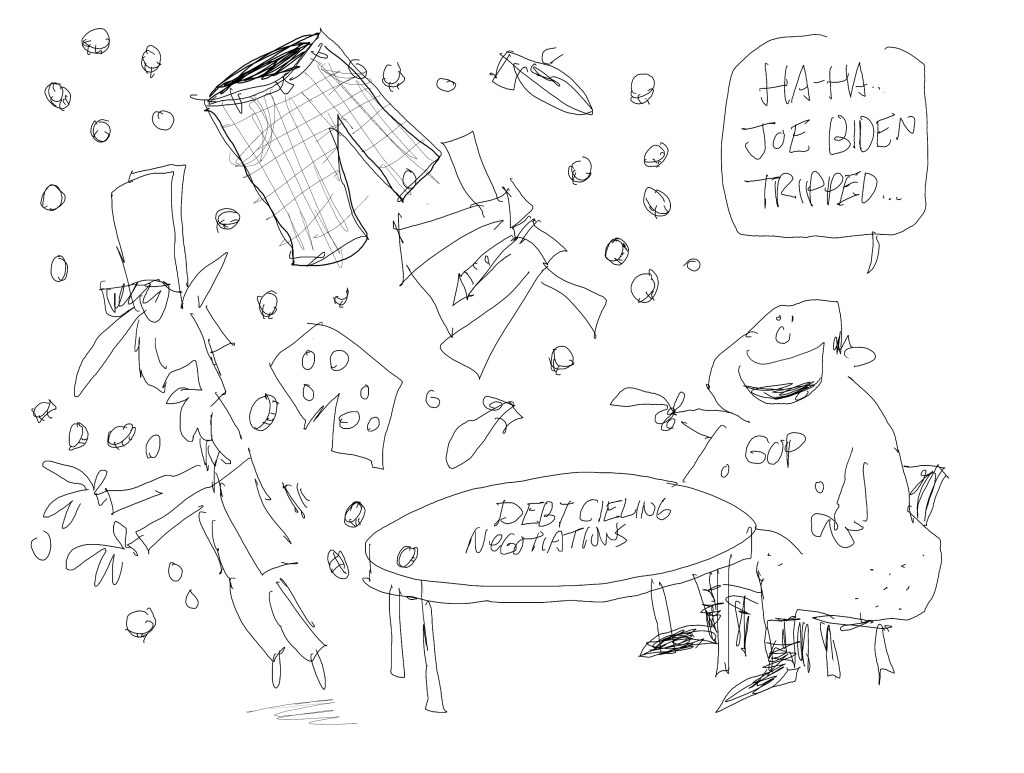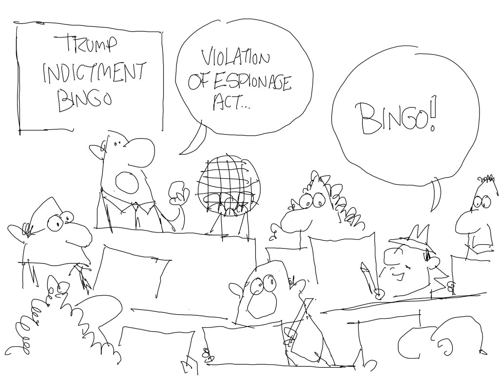 This is from last year and I was saving it for when a report would come out that Trump sold documents. I’m still not convinced that’s not going to happen, but I used half the idea a couple weeks ago, so it’s time to let this one out now. I don’t know exactly how long ago I drew this but it’s number 1846 and the one at the very bottom of this blog is 2556. According to Alexa’s math, I drew 710 roughs between these two. Yes, every rough has a number and I don’t do math.