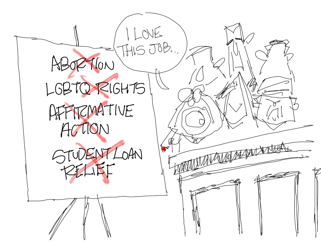 I was thinking about the fact that this Supreme Court has taken away more rights and liberties than any before it when I wrote this cartoon. But I didn’t think it was good enough.