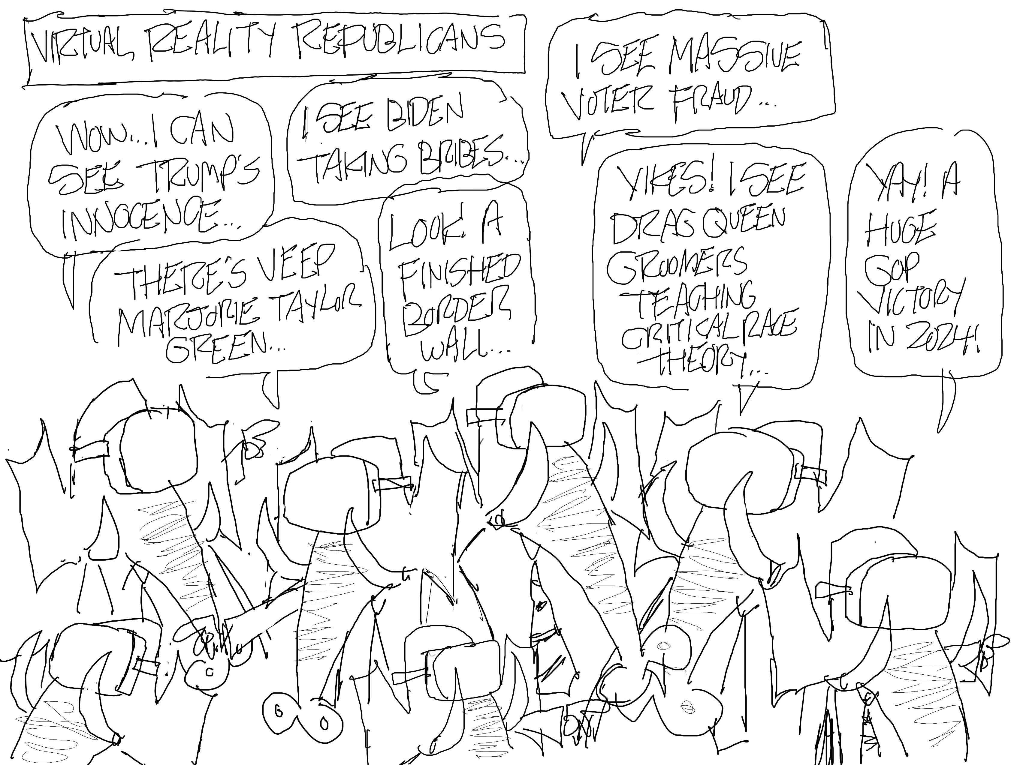 Anyway, shortly after the train pulled out of Miami, I started to draw this. Virtual Reality was in the news that week along with Trump’s second indictment and arraignment, and I thought this was a good cartoon. The nice old lady sitting next to me thought so too, but I stopped drawing it. Do you know why I stopped drawing it? Because the train was too shaky for me to do this much lettering and to draw this many elephants with this sort of strategic placement, so I drew Chompers instead. I like Chompers and so did the nice old lady who got off in Port St. Lucie and oddly enough, I made it all the way to Fredericksburg without anyone else sitting next to me which must have been some kind of miracle. Maybe the Amtrak gods were making up for sticking me next to so many fuckers from Jacksonville on my way to Miami.