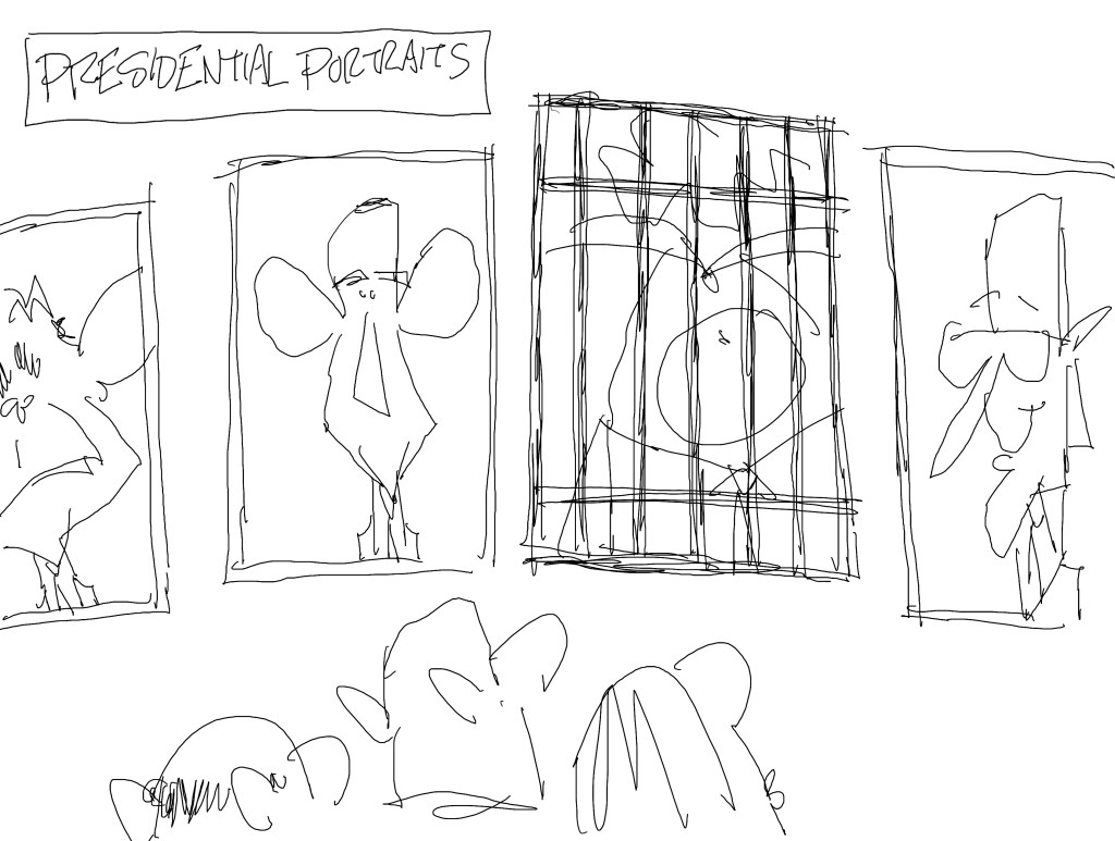 Now, if I had known the train was going to stop for eight hours in South Carolina, maybe I would have drawn the elephants or gotten off the train in Port St. Lucie with the nice old lady, but by that point, I was onto my CNN cartoon for the week, so I shelved this and it went into the Maybe folder. I liked it and wanted to do it.