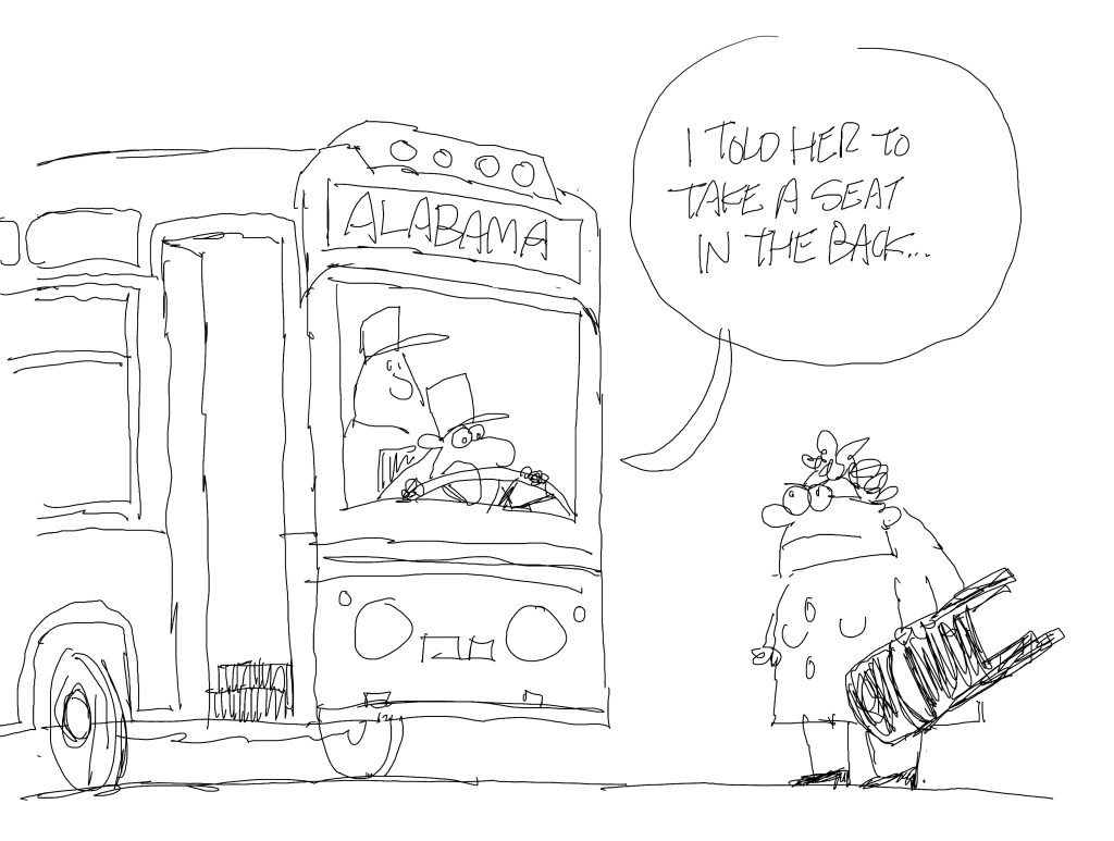 This rough, and the next one, were drawn in the middle of last week after that Alabama Riverboat brawl broke out. At first, I wasn’t just trying to draw something on racism in general, and instead, focus on Alabama racism. However, I felt this got a bit complicated with all the labels. But other than the riverfront brawl, Alabama has recently refused to create a second congressional district with a black majority despite being ordered to do so by the Supreme Court (shit. Alabama’s more racist than our current Supreme Court?), and a small town in the state is refusing to recognize a black guy won its race for mayor.