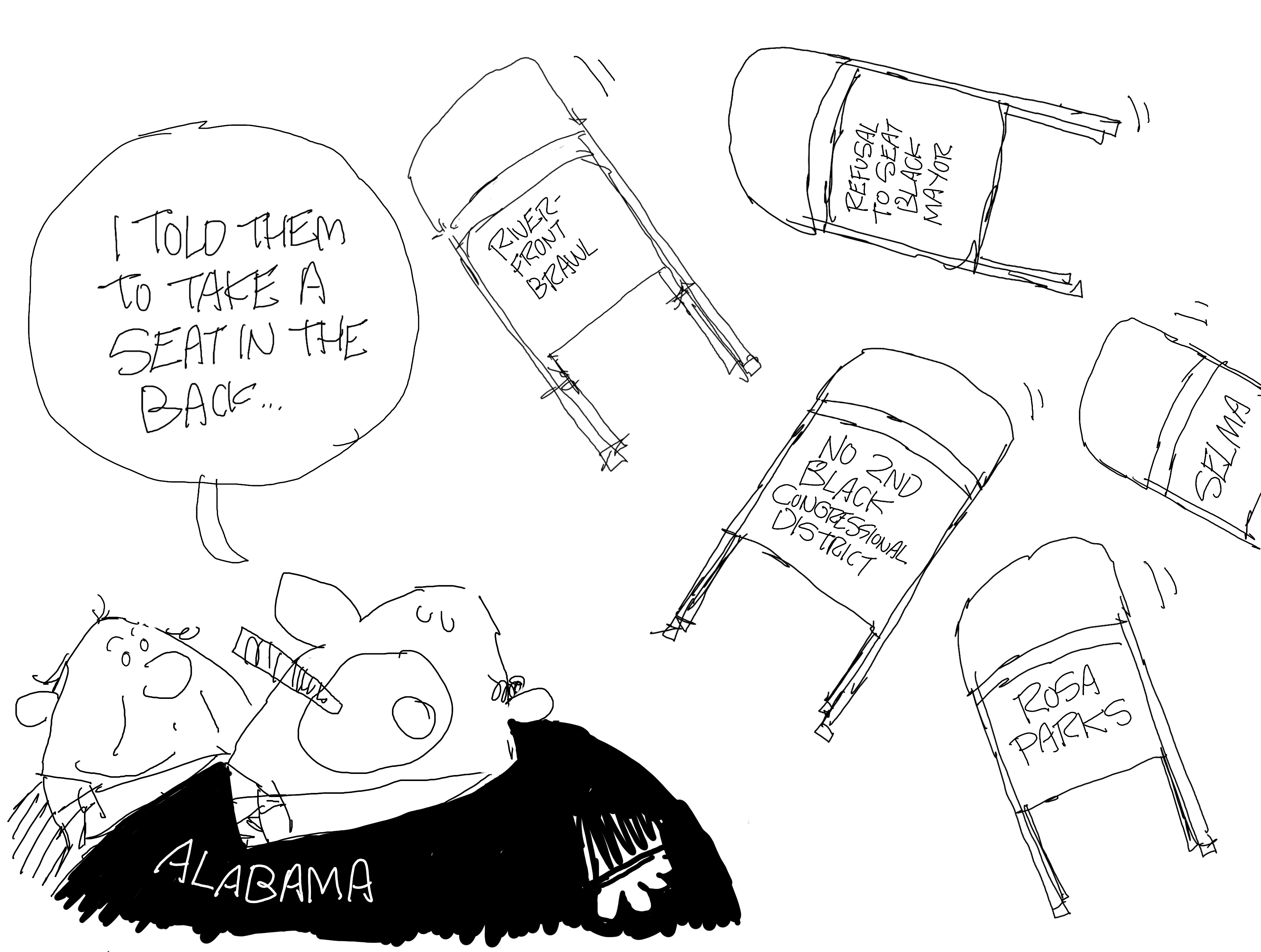 This rough, and the next one, were drawn in the middle of last week after that Alabama Riverboat brawl broke out. At first, I wasn’t just trying to draw something on racism in general, and instead, focus on Alabama racism. However, I felt this got a bit complicated with all the labels. But other than the riverfront brawl, Alabama has recently refused to create a second congressional district with a black majority despite being ordered to do so by the Supreme Court (shit. Alabama’s more racist than our current Supreme Court?), and a small town in the state is refusing to recognize a black guy won its race for mayor.