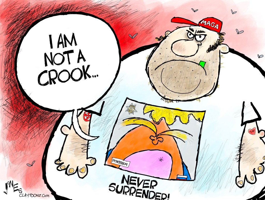 Creative note: I drew a cartoon of the T-shirt for CNN this weekend. I used the actual mugshot photo for that cartoon as I thought it’d be more powerful and funny than my caricature. I considered using the actual photo again for this cartoon, but after looking at a few of my colleagues’ cartoons where they actually traced the mugshot photo, I felt I should draw it myself. I was concerned that my caricature of Trump wouldn’t work for the photo, but after taking a shot at it, I do think it works.
