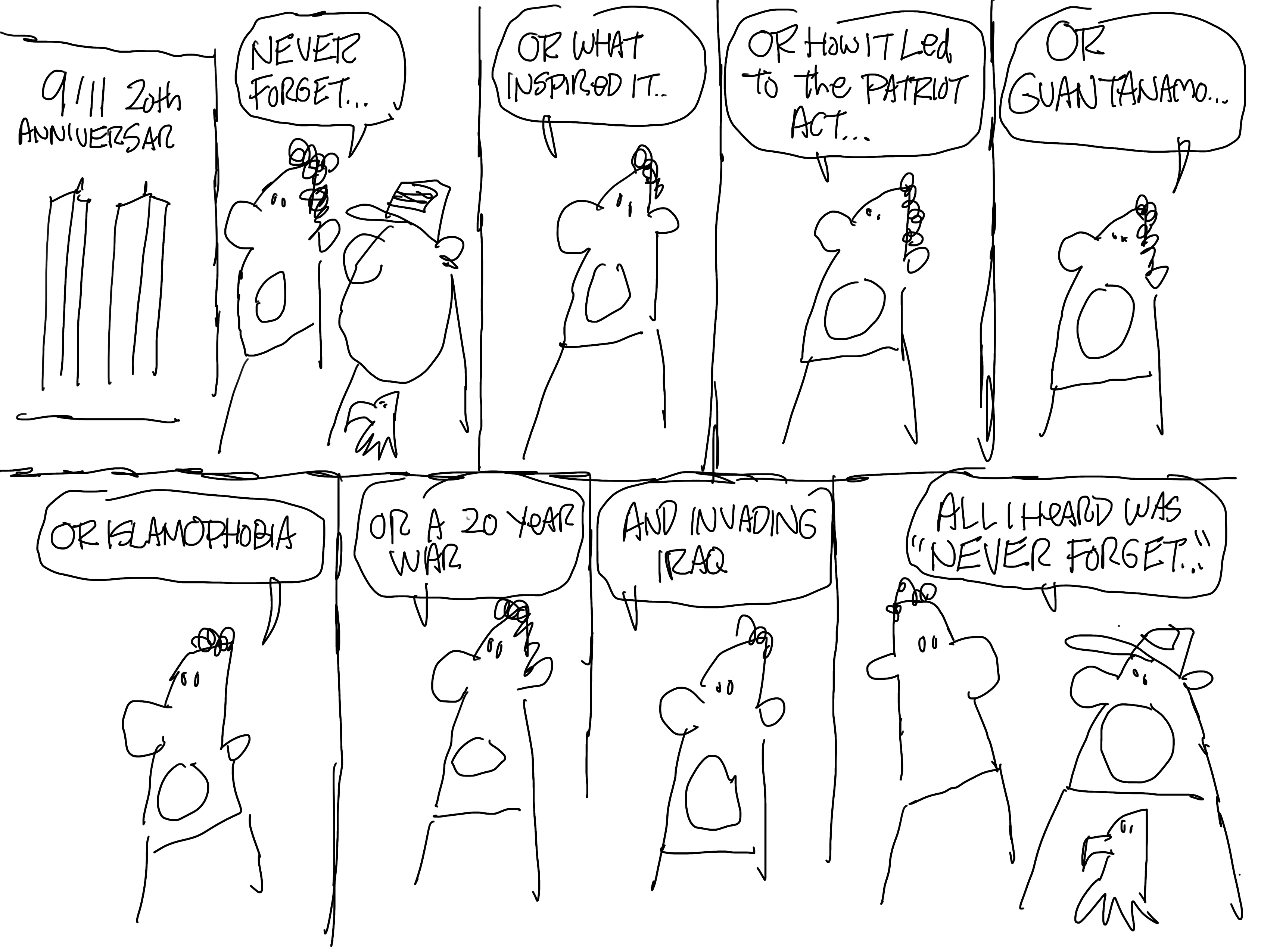 This is a rough I drew two years ago and put into my Maybe folder. The rough has the 20th anniversary labeled in it. This was originally shelved to be resurrected for September 11, 2022, but when that time came, Queen Elizabeth had just died and somebody had to draw a Beefeater cartoon, so it had to wait another year. I finally drew it and it went over pretty well on social media.