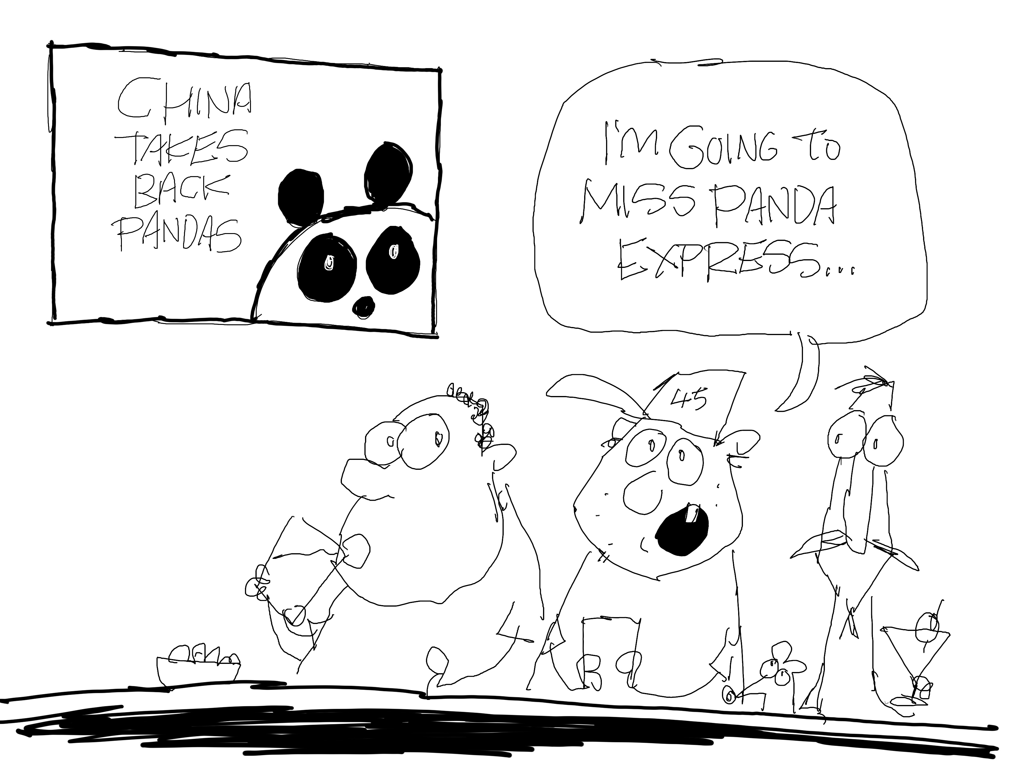 I just thought this was funny but I didn’t make a real cartoon out of it because I had already done enough with the pandas. By the way, I don’t believe anyone in China would recognize the food at Panda Express. It’s to Chinese food like Taco Bell is to Mexican food.