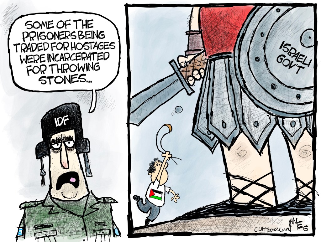 It’s been about 40 minutes since I posted this cartoon on Twitter/X and it’s already received criticism from someone complaining that the Palestinians weren’t throwing stones at the Israeli government, but at soldiers. Some people are not good with metaphors or understanding that soldiers are part of a government. Who sent the soldiers? I can’t even with some people.