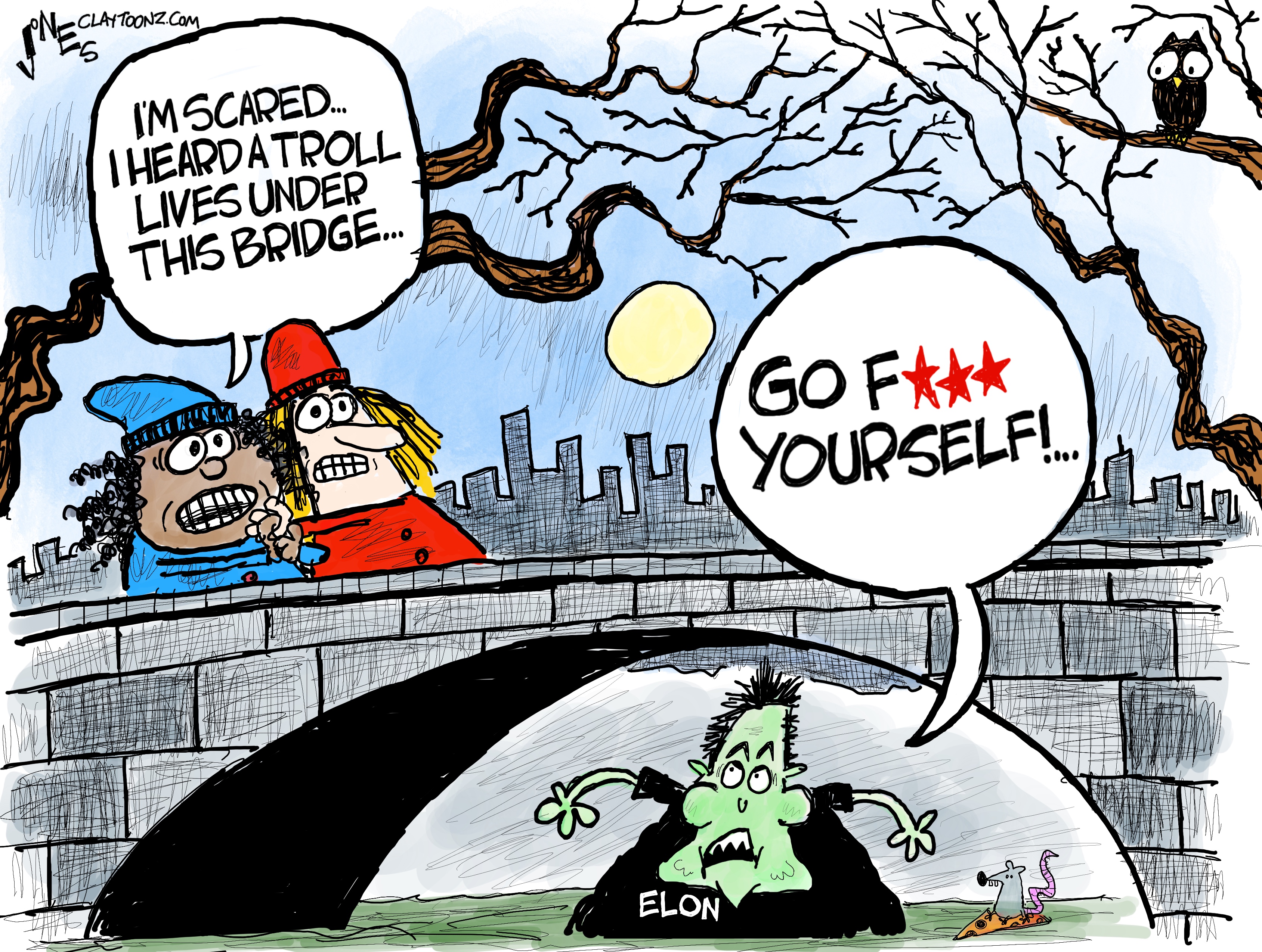 A comment (that’s since been deleted) by a goon at GoComics on my last cartoon on Elon defended him. The person said something about how he liked that Elon was defending white people. Isn’t it a shame that white male billionaires can never catch a break? Oh, the persecution. the next time you run into a persecuted white male billionaire, give him a hug. Oh yeah. That same commenter has accused me of being racist against white people. That’s not how any of this works.