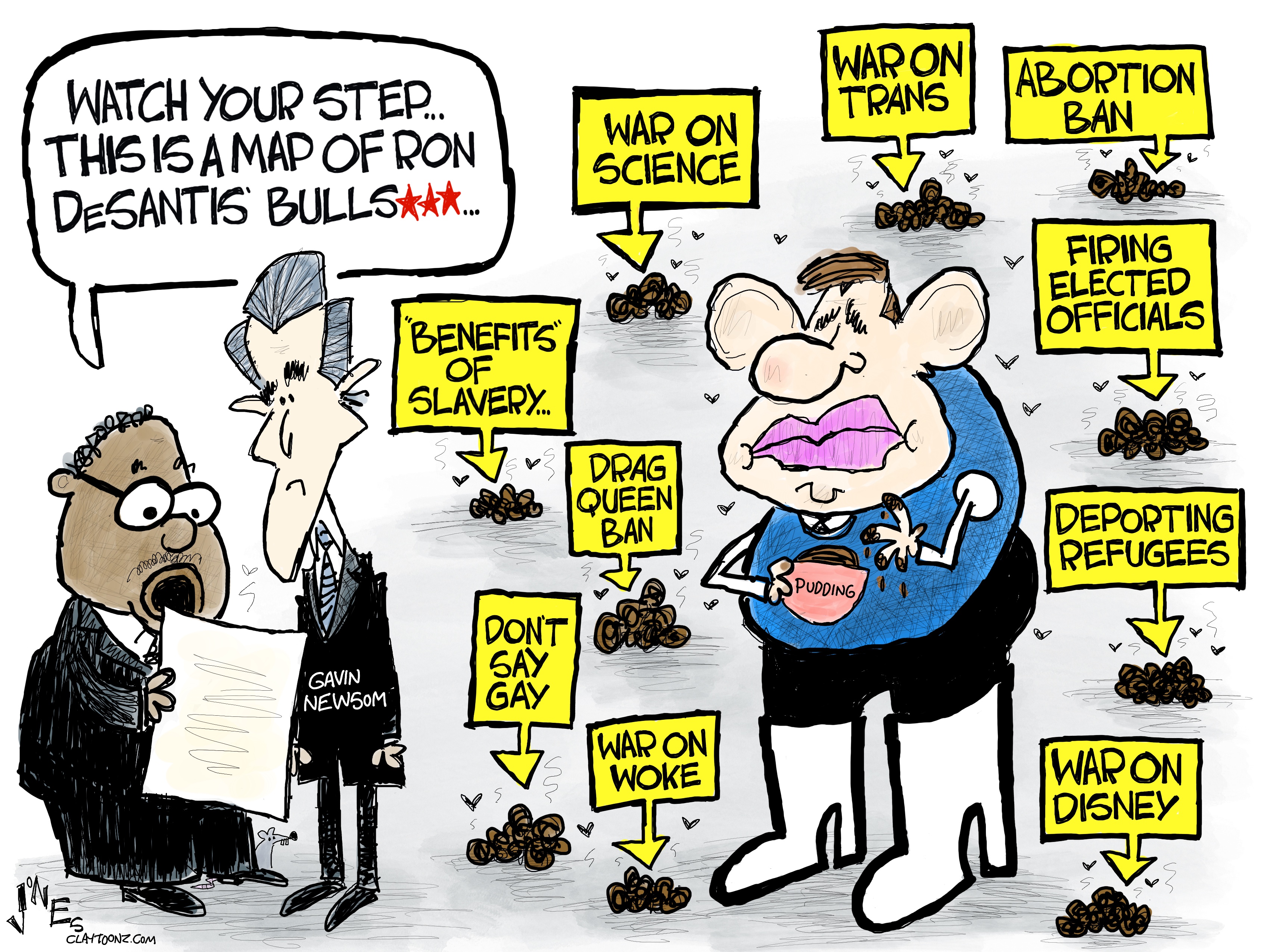 The debate was mostly for pure entertainment since these guys aren’t in a race with each other, despite presidential candidate DeSantis accusing Newsom of conducting a shadow campaign. But if you want to argue red state versus blue state, or DeSantis’ accomplishments versus Newsom’s, soak in the fact that DeSantis is behind Donald Trump by over 40 points…in Florida. Republicans in Florida would rather have a racist twice-impeached Putin-loving pussy-grabbing fascist who’s currently facing 91 criminal charges to be president over their governor.