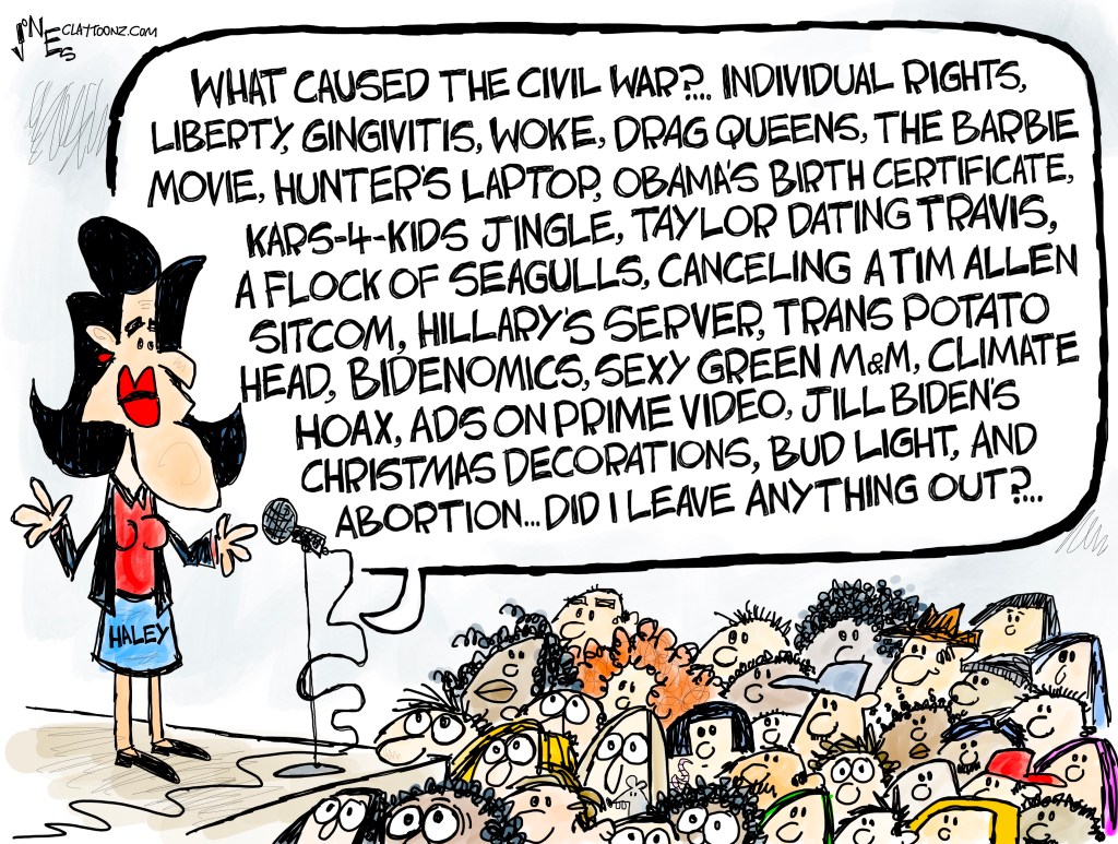 Haley replied, replied, “Well, don’t come with an easy question.” Except it is an easy question with an easy answer. Instead of giving the easy answer, Haley replied with a word salad of, “I think the cause of the Civil War was basically how government was going to run, the freedoms and what people could and couldn’t do. I think it always comes down to the role of government and what the rights of the people are. And I will always stand by the fact that I think government was intended to secure the rights and freedoms of the people. It was never meant to be all things to all people. Government doesn’t need to tell you how to live your life. They don’t need to tell you what you can and can’t do. They don’t need to be a part of your life.”