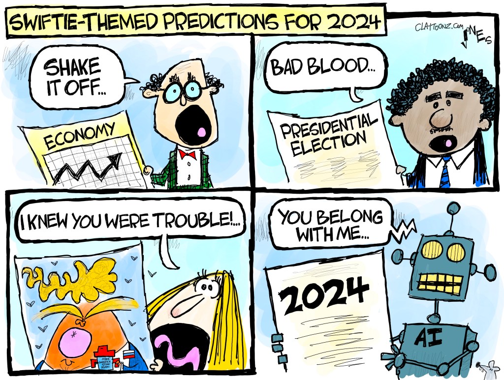 And no, I’m not on a Taylor Swift kick, but there’s a reason why I was focused on the theme. This is my New Year cartoon for my syndication. And, right after I woke up, proofreader Laura, my friend who’s one of the sharpest people ever, told me it’s “Swiftie,” not “Swifty” and I figured, eh….I don’t need to make a change…until one minute later, the Washington Post emailed asking if I could make that change. Why of course I could. I sent the corrected version to all my clients.