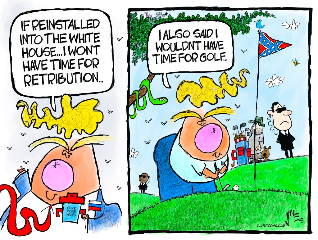 Trump didn’t just manage to break his golf promise but was also able to use it to grift taxpayers. He only played golf at his resorts which meant taxpayers had to foot the bill to government employees forced to travel with the president (sic). Trump even raised rates at his resorts to charge the government for the stay of employees. He rented golf carts to the Secret Service so they could follow him while he cheated at golf. Of course, nobody ate for free at Trump Resorts. The government had to keep rooms rented just in case Trump, as president (sic), would demand to make a golf trip on a whim which meant we were paying Trump to play golf even when he wasn’t playing golf. And since Trump has Secret Service protection as a former president (sic), he’s still grifting taxpayers while playing golf.