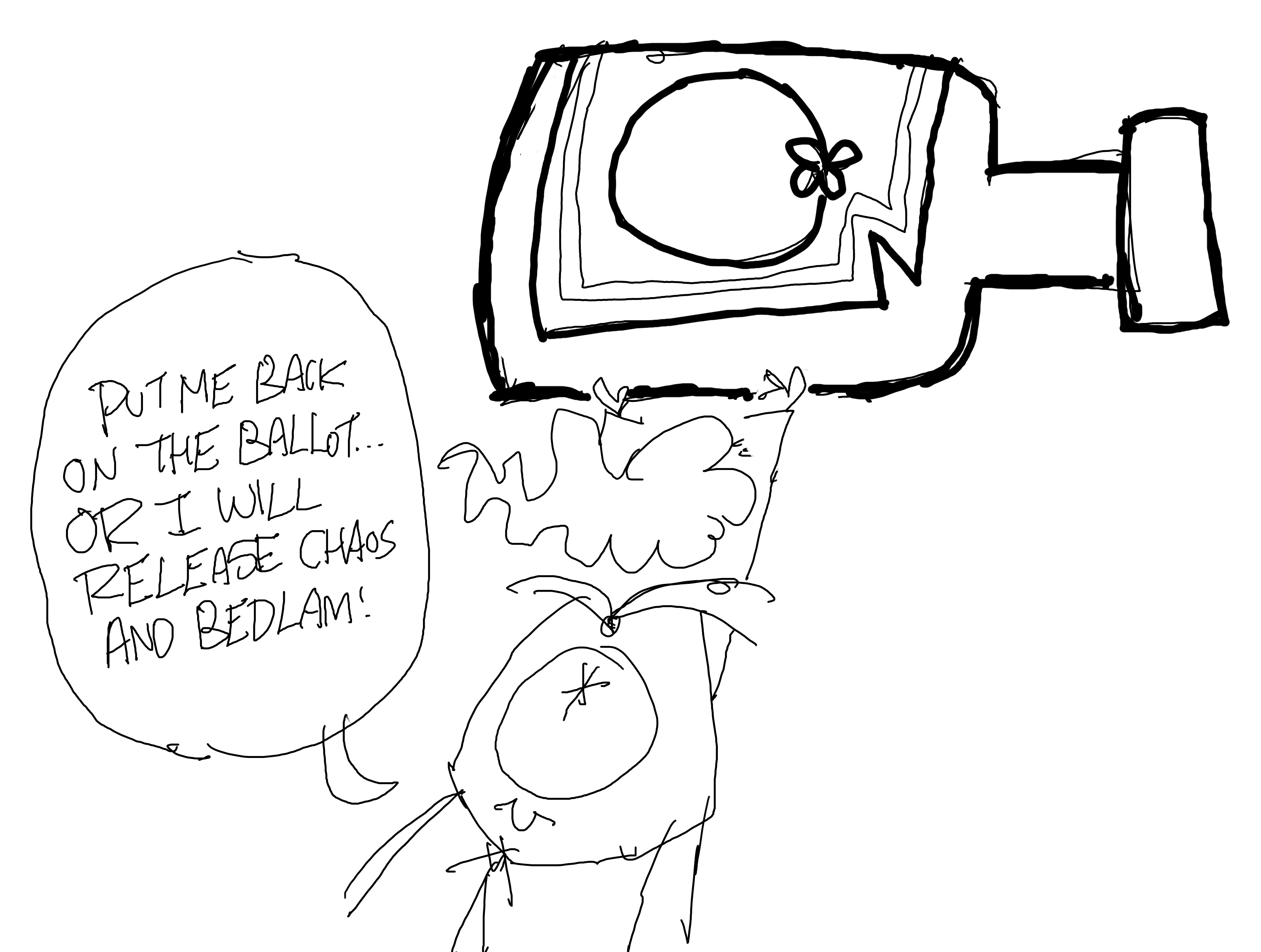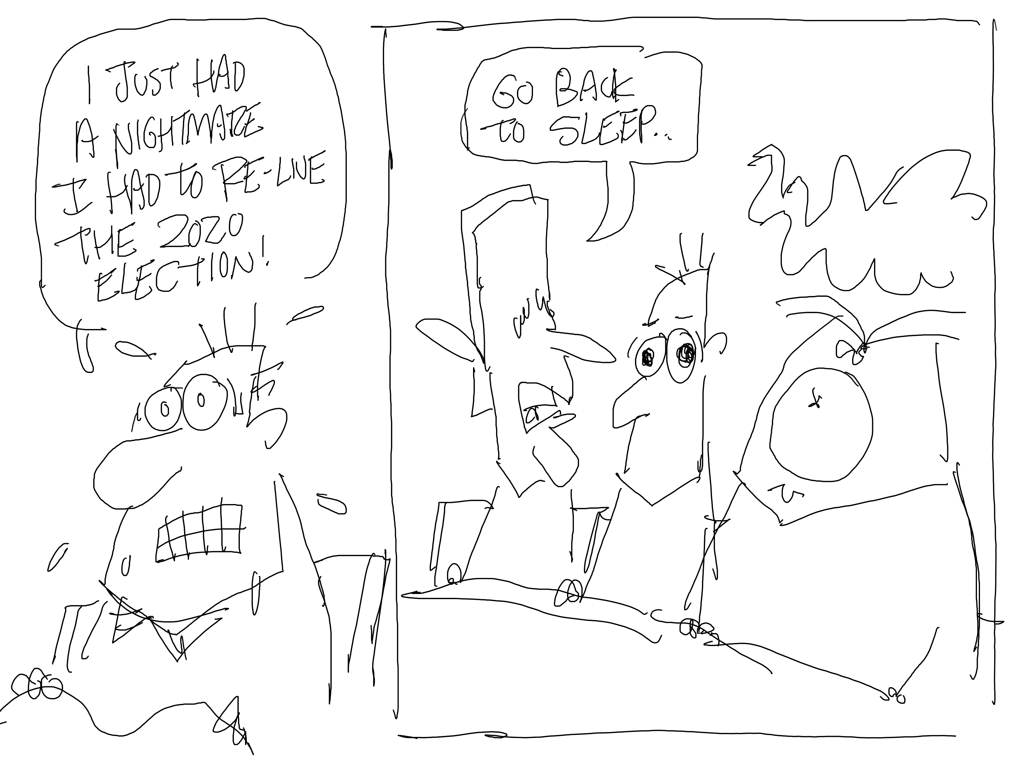 But the subject was assigned and reliving the 2020 election is a nightmare for me, but I still don’t want to both-sides it. So I at least made it funny. I think so anyway. I always like the trick in TV or movies when someone wakes from a nightmare only to find themselves in another nightmare.