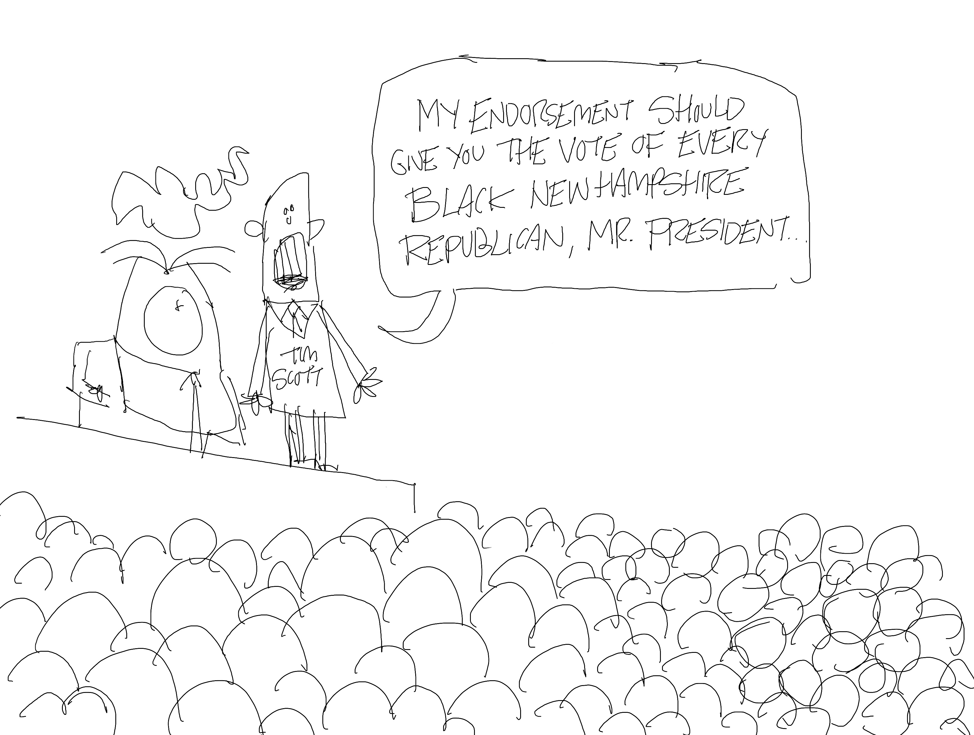 I didn’t like this one very much. I wasn’t afraid of it. I just don’t think it’s very good or believe that Tim Scott’s endorsement is really worthy of a cartoon.