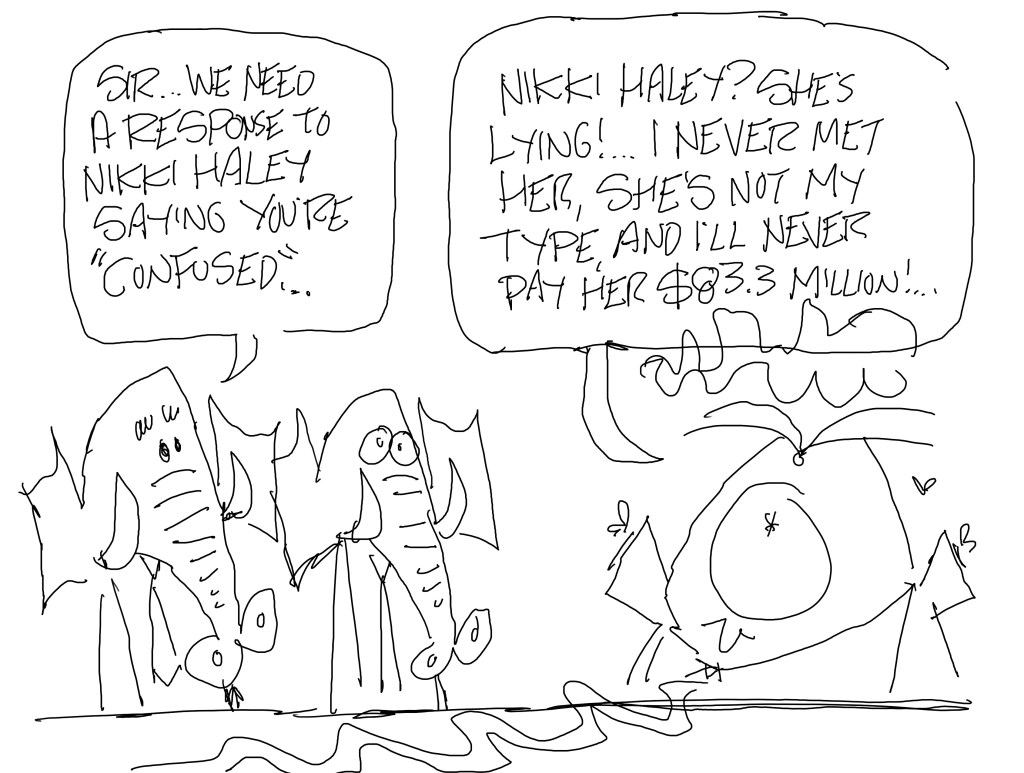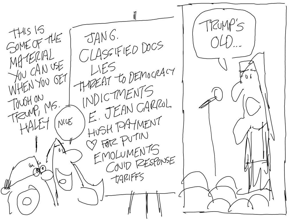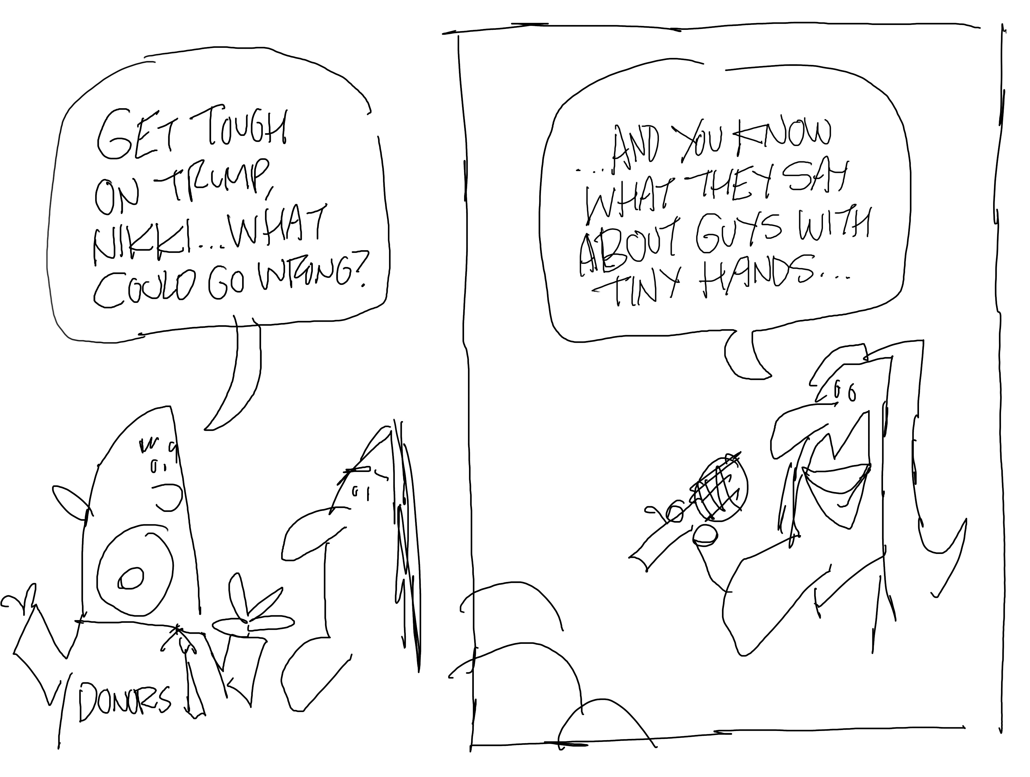 I was so tired of drawing roughs at this point that I didn’t bother to finish this one which is odd because it’s the only Nikki Haley one I liked, and I really like it.