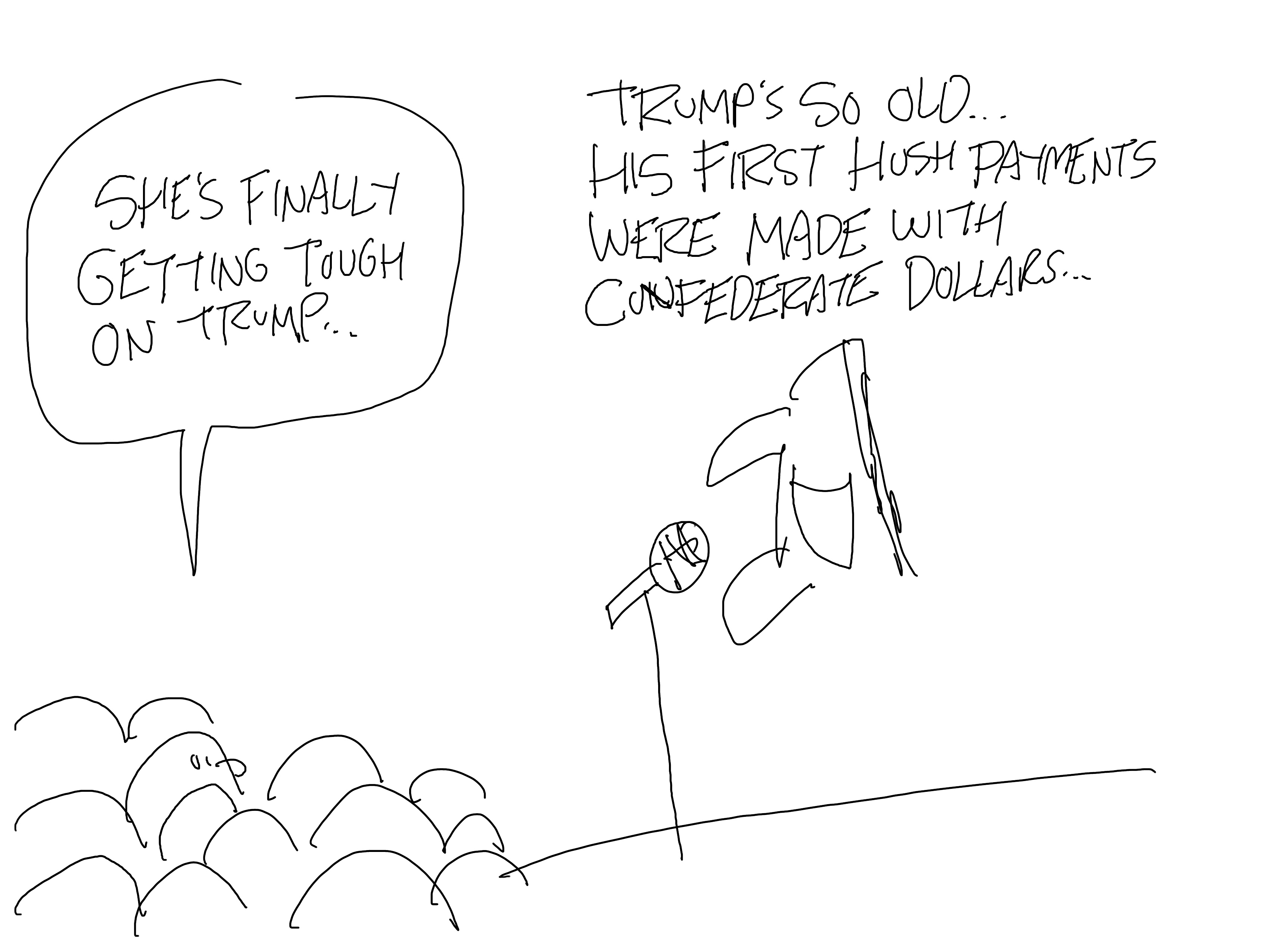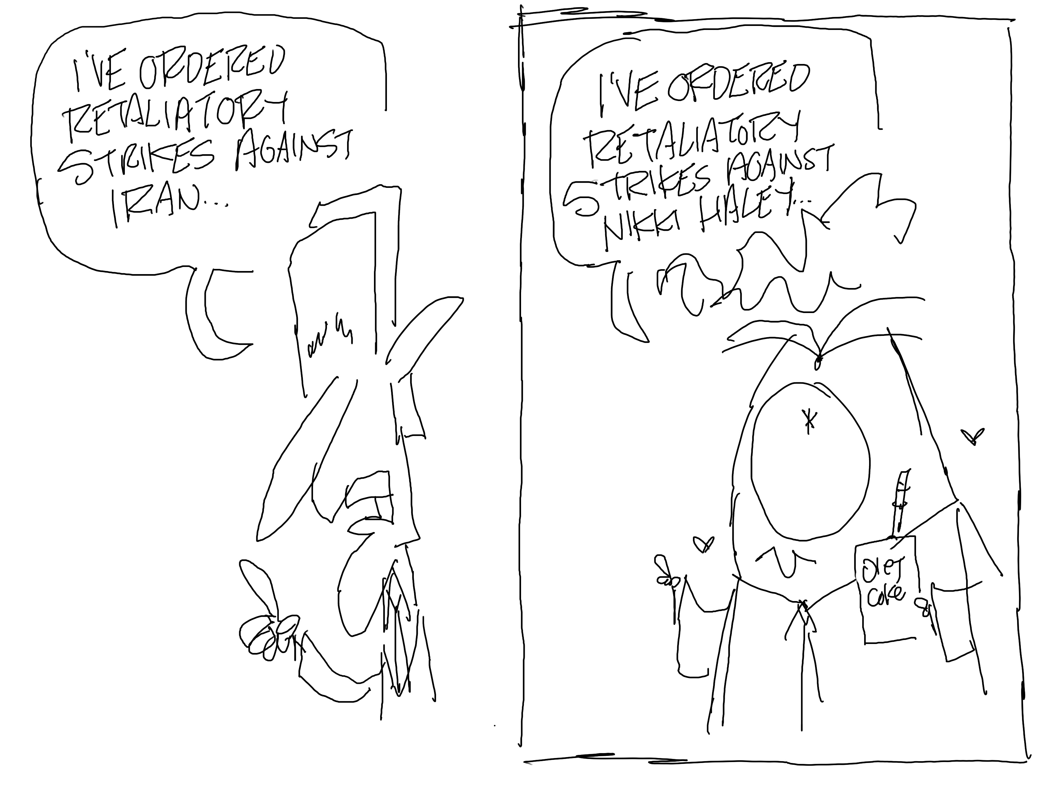 This became the cartoon for the CNN Opinion newsletter. I like it. I was drawing ideas on Nikki getting tough on Donald, and then the bombings started…so I combined the two.
