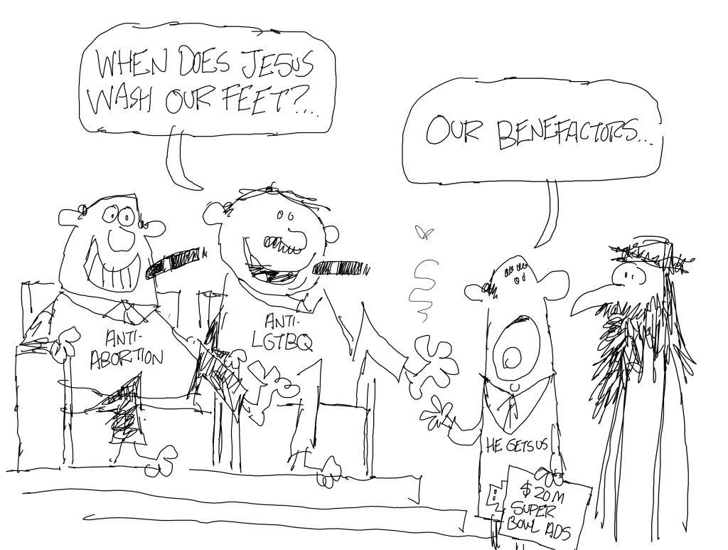 I drew this last Tuesday, February 13. I liked the point it was making but I decided to go with funnier. This was a situation where I bounced both ideas off a couple of friends.