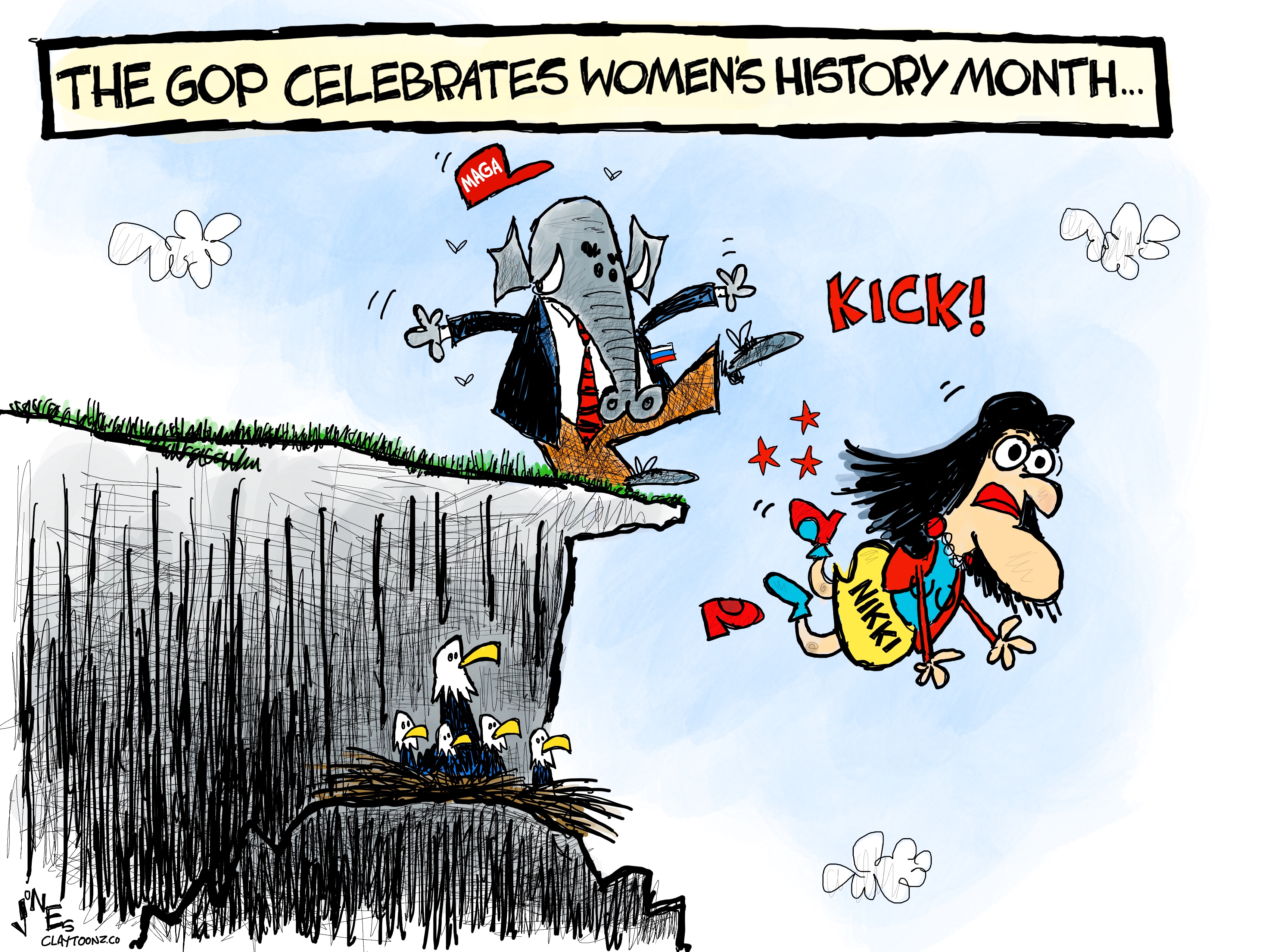 Creative note: I think this is my first cliff cartoon in about three years. I’m not a big fan of them and I believe they’re the most used trope in political cartooning. Despite that, I couldn’t resist the temptation to draw this after I roughed it out. Maybe it’s the Eagles.