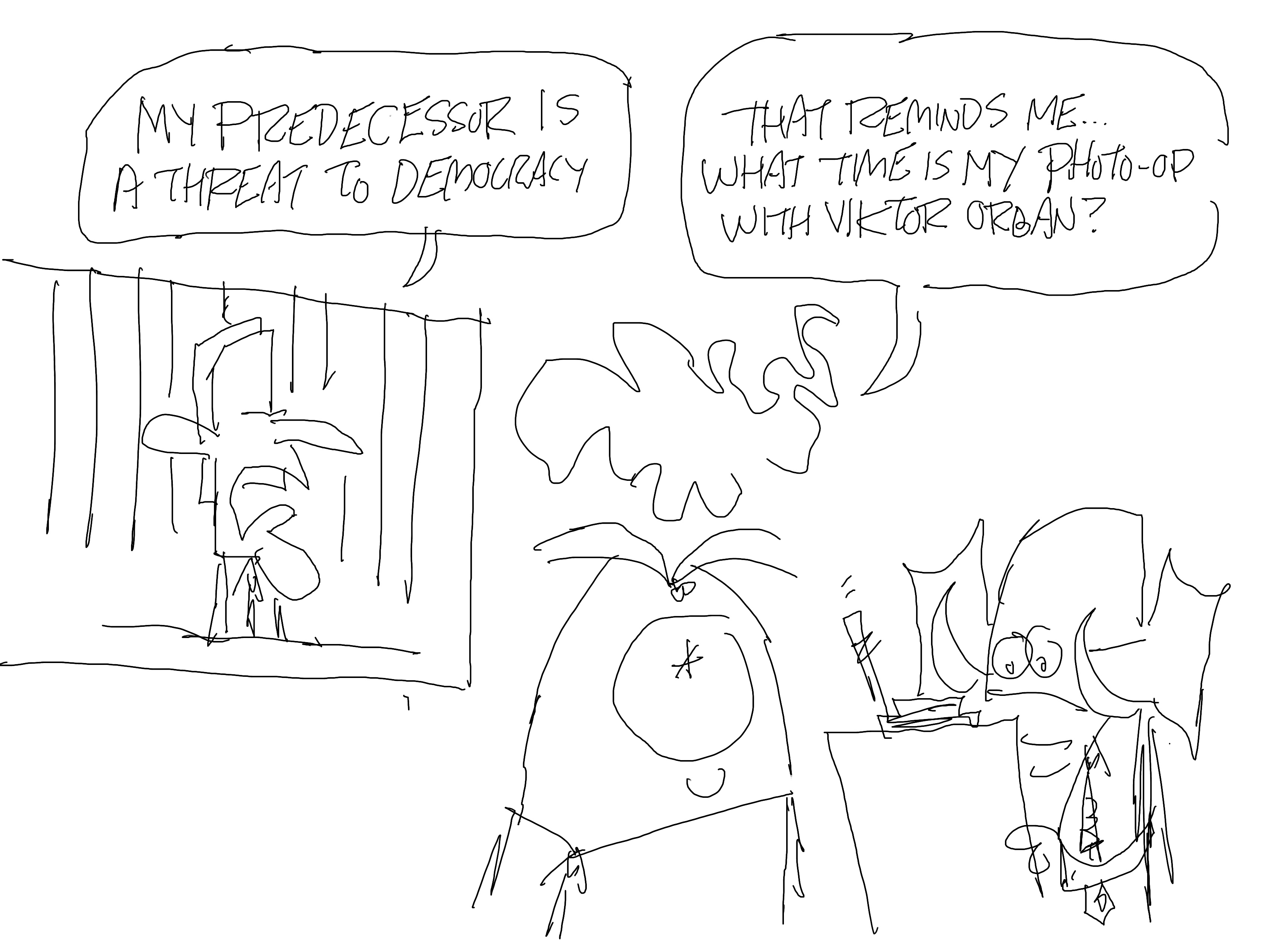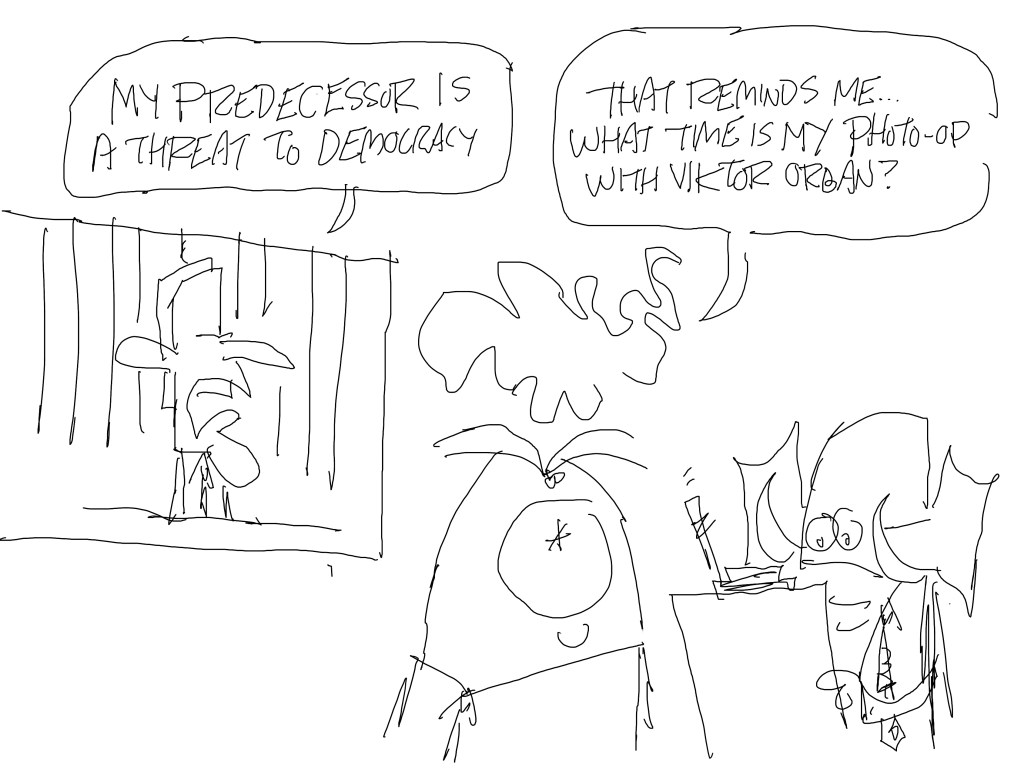 Shortly after the State of the Union, Donald Trump hosted Viktor Orban, a fascist bigoted ruler of Hungary, to MAGA-Lardo. It’s like they’re trying to help President Biden make his point.